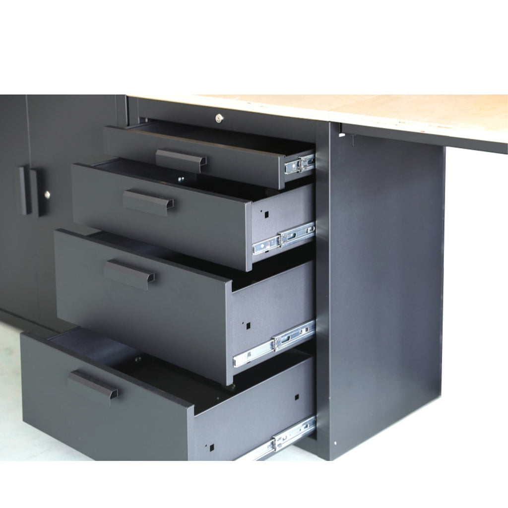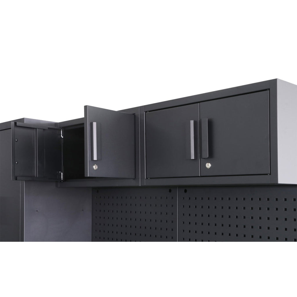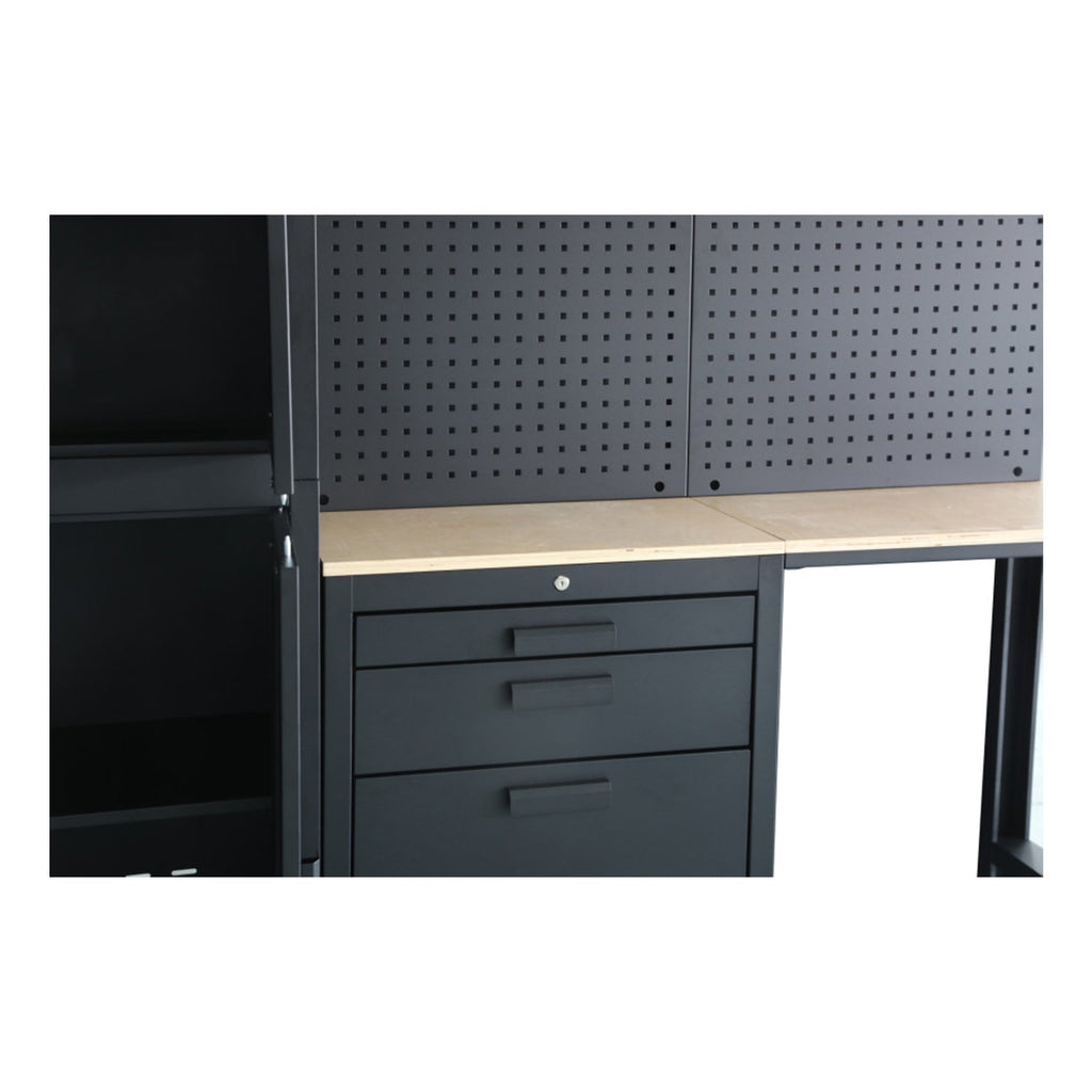 TÁTO SADA MODULÁRNEHO KOVOVÉHO PRÉMIOVÉHO NÁBYTKU DO DIELNE 8 KUSOV MATNÁ ČIERNA ponúka dostatok pracovného priestoru na organizáciu a usporiadanie náradia, zariadení a príslušenstva. S pracovnou doskou s rozmermi 86.85 x 86.05 x 46.3 cm je pracovný stôl ideálny na vykonávanie menších prác. Zásuvky sú vybavené ložiskovými vodičmi a skrinky majú magnetické uzávery a zámok s dvomi kľúčmi.