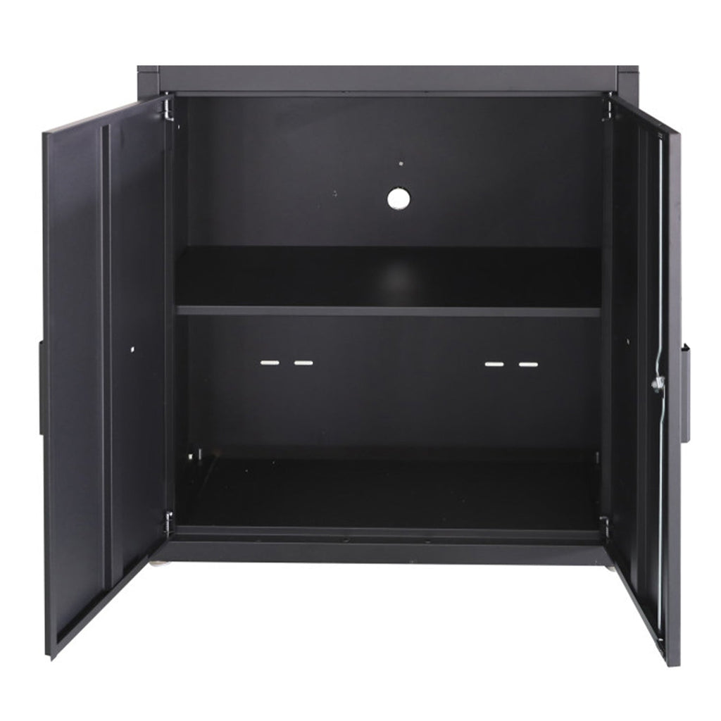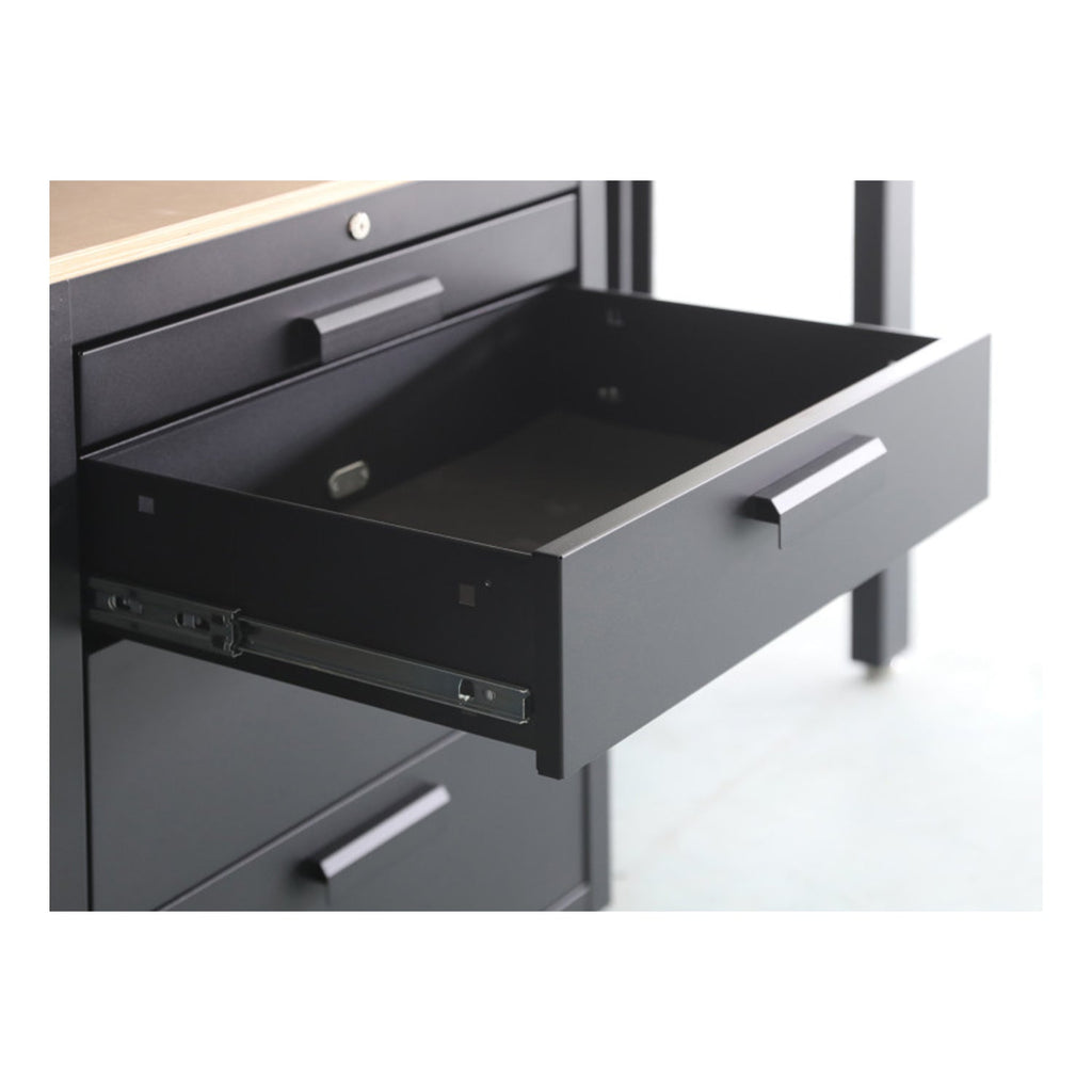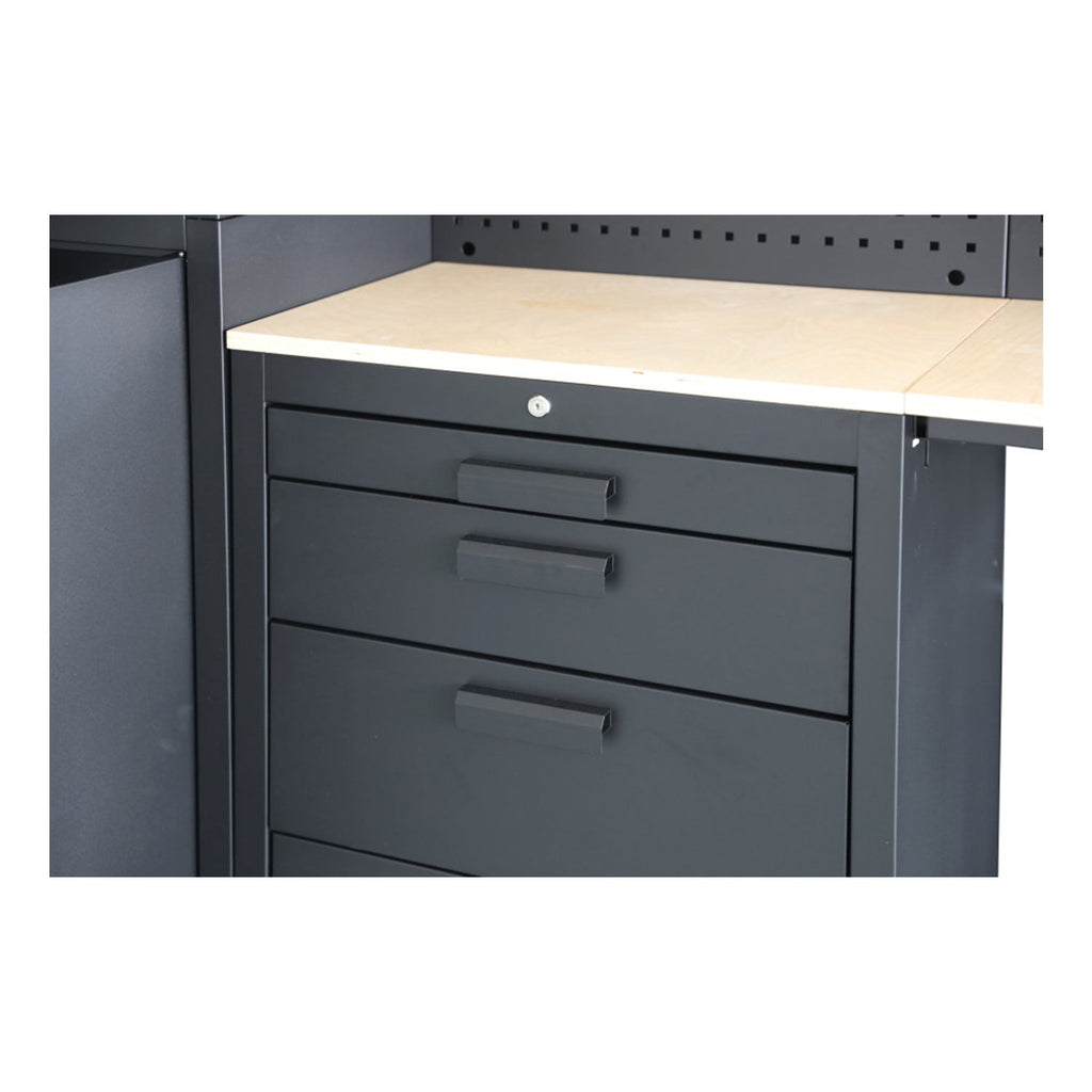 TÁTO SADA MODULÁRNEHO KOVOVÉHO PRÉMIOVÉHO NÁBYTKU DO DIELNE 8 KUSOV MATNÁ ČIERNA ponúka dostatok pracovného priestoru na organizáciu a usporiadanie náradia, zariadení a príslušenstva. S pracovnou doskou s rozmermi 86.85 x 86.05 x 46.3 cm je pracovný stôl ideálny na vykonávanie menších prác. Zásuvky sú vybavené ložiskovými vodičmi a skrinky majú magnetické uzávery a zámok s dvomi kľúčmi.