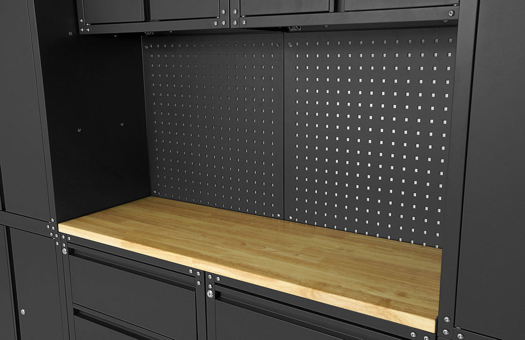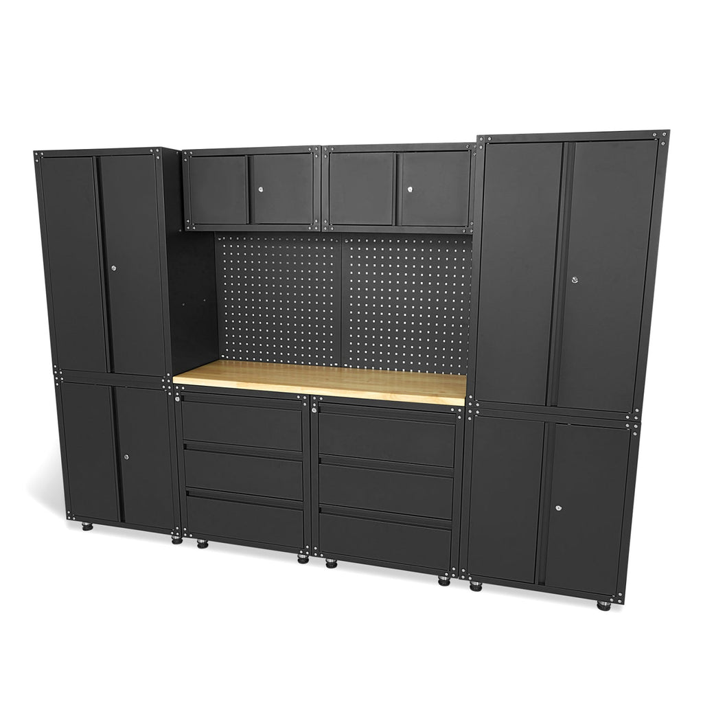 TÁTO PRÉMIOVÁ MODULÁRNA KOVOVÁ SÚPRAVA NÁBYTKU HBM MACHINES 11 KUSOV, 187.5 X 268.5 X 48.2 CM MATNÁ ČIERNA je vhodná na vybavenie dielne, pretože má zásuvky na odkladanie a pracovnú dosku.