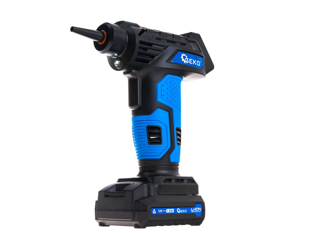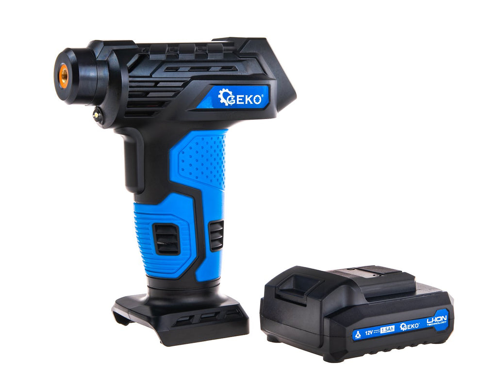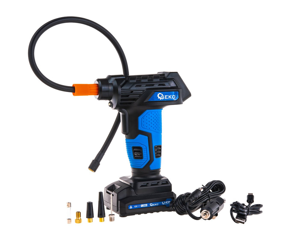 PRENOSNÝ AKUMULÁTOROVÝ KOMPRESOR DO AUTA 12V S LCD DISPLEJOM GEKO je bezdrôtové zariadenie napájané Li-ion batériou 12V / 1,5Ah, vhodné na dofukovanie pneumatík, lôpt a nafukovacích matracov. Má digitálny displej na manuálne nastavenie tlaku a štyri predvoľby pre autá, motocykle, bicykle a lopty. Max. tlak je 10,3 bar (150 psi), prietok 23 l/min, priemer valca 21 mm.