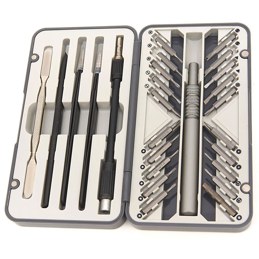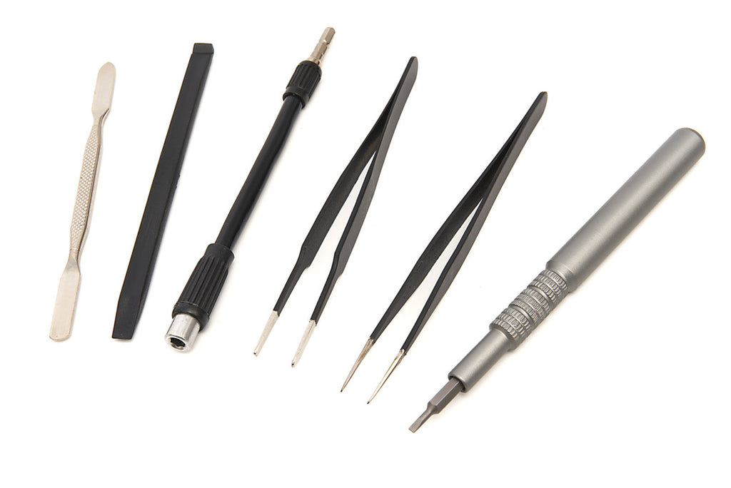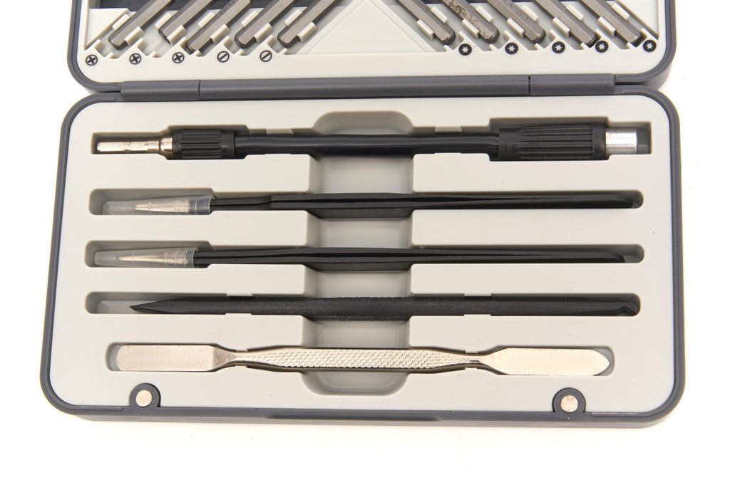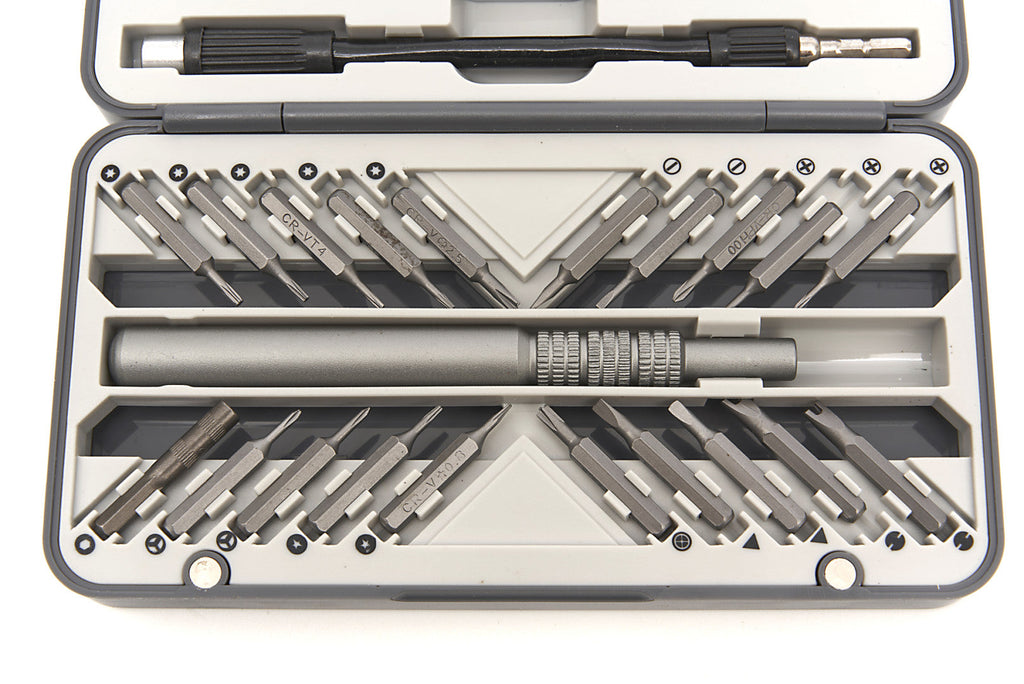 Súprava sa skladá zo skrutkovačov s rôznymi hrotmi, ako sú: drážka/rovný, kríž, Torx, šesťuholníkové, Tri-Wing, trojuholník a pevné hroty.