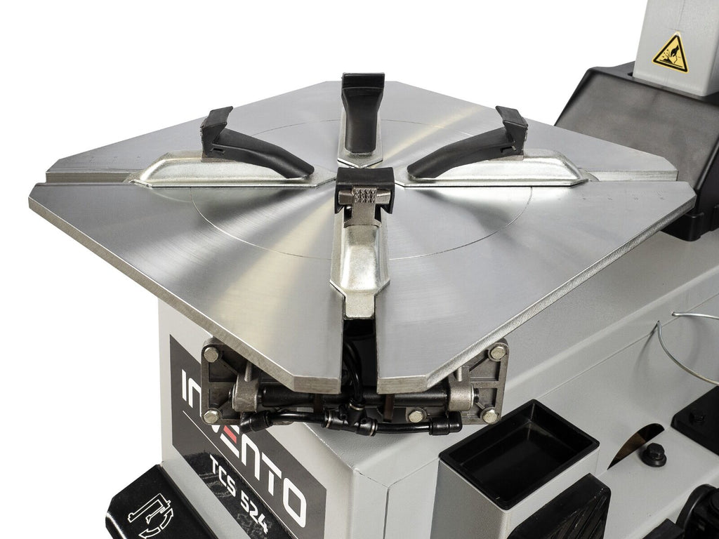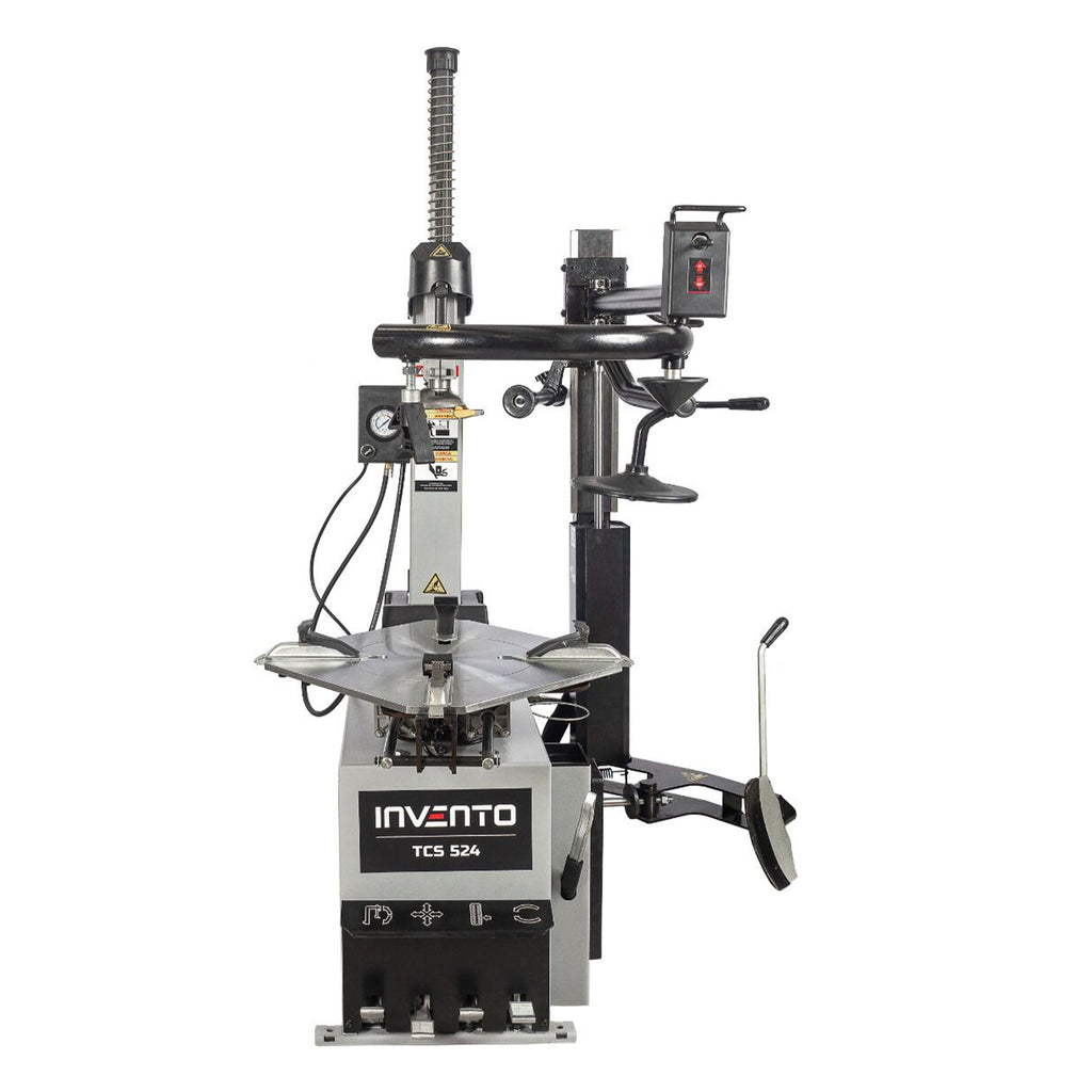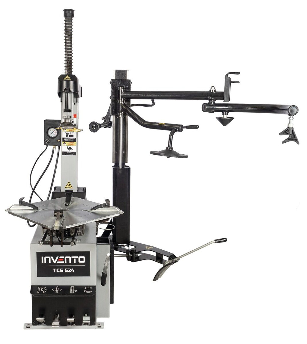 PREZÚVAČKA PNEUMATÍK S AUTOMATICKÝM RAMENOM RUNFLAT 24” 380V INVENTO je určená na montáž a demontáž automobilových pneumatík, vrátane Runflat a nízkoprofilových. Je vybavená montážnym stĺpom s pneumatickým sklápáním a upínacím stolom kompatibilným s diskami s vnútorným upnutím medzi 12” a 24” a vonkajším upnutím medzi 14” a 26”. Pracuje s kolesami so šírkou do 13” a s maximálnym priemerom disku 1100 mm. Odtláčací mechanizmus pätky vyvíja silu 2500 kg.