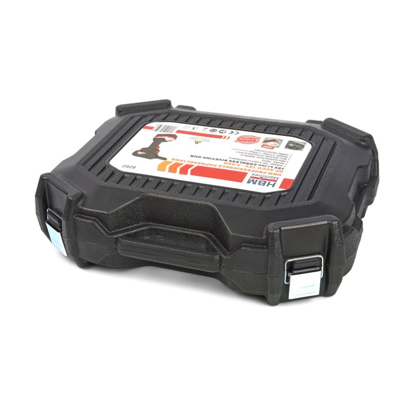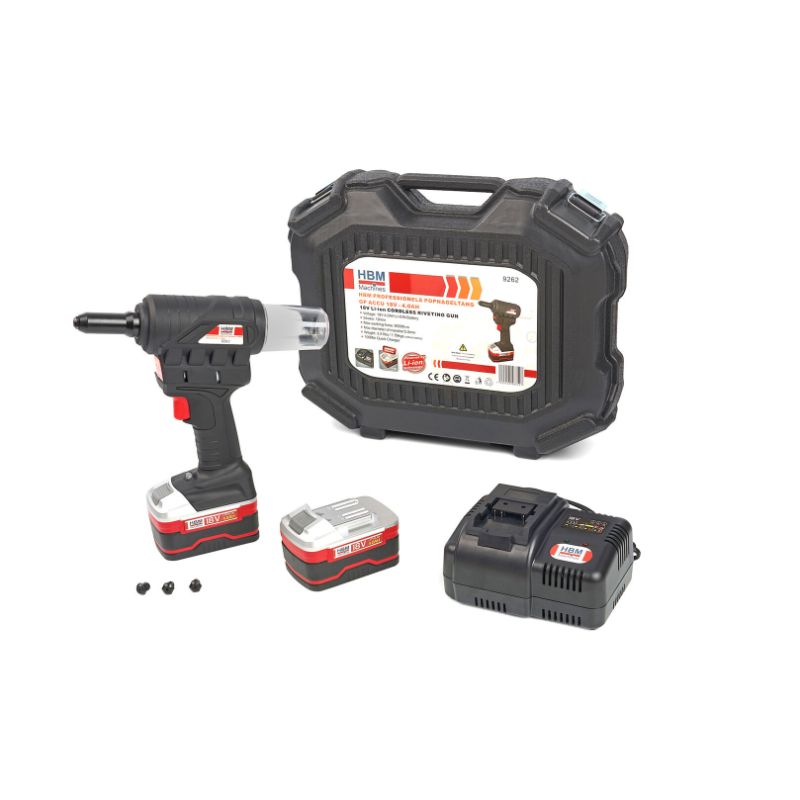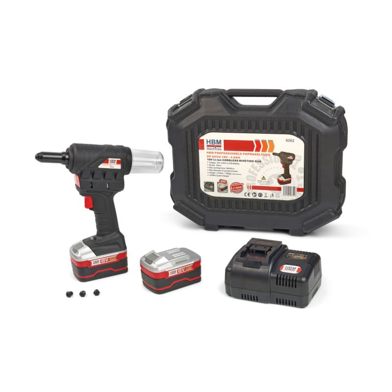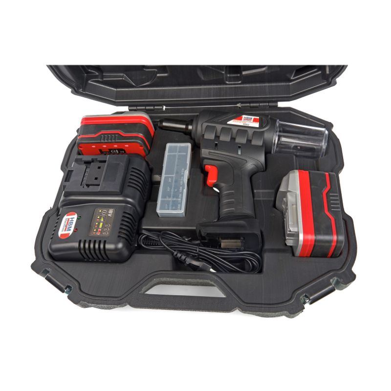 TÁTO PROFESIONÁLNA ELEKTRICKÁ NITOVACIA PIŠTOĽ S AKUMULÁTOROM 18V 4.0AH sa dodáva v pevnom úložnom kufríku s 2 batériami. Maximálna pracovná sila: 9000NM.