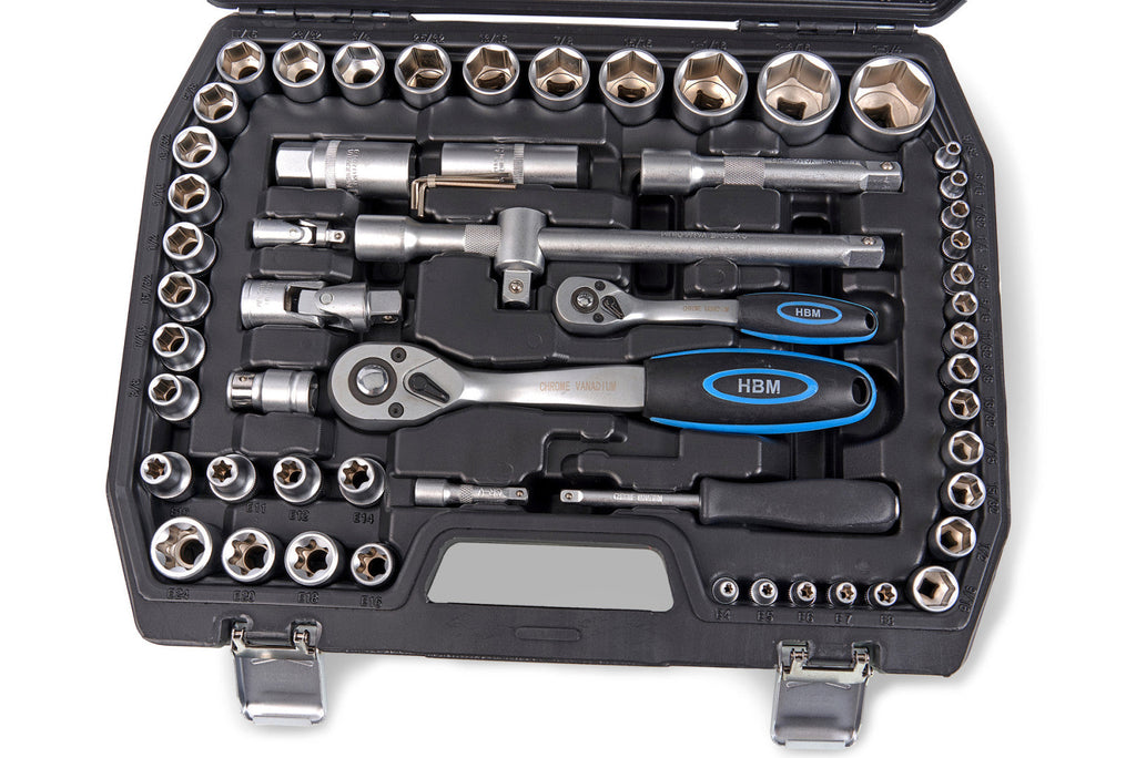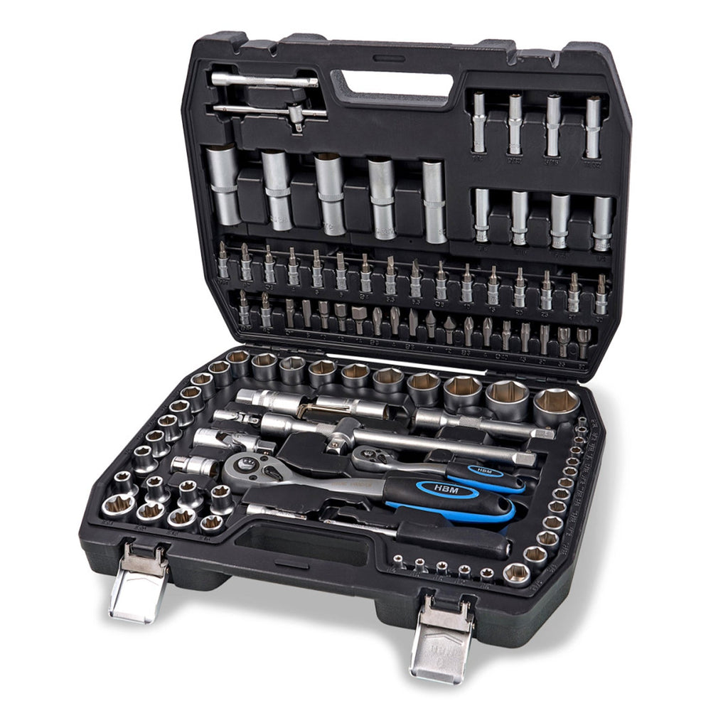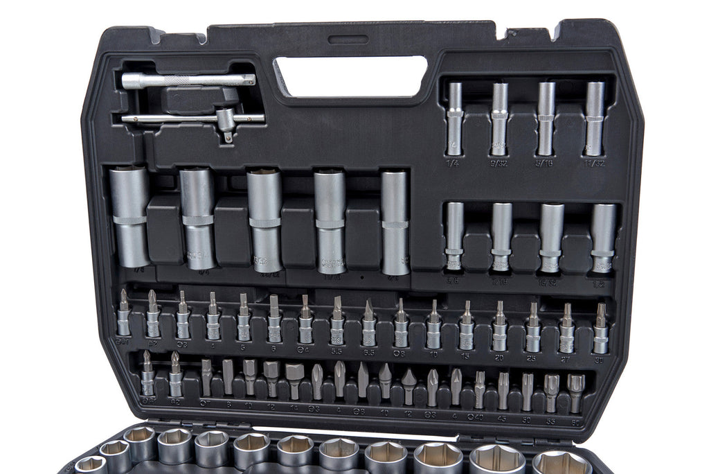 PROFESIONÁLNA SADA NÁSTRČNÝCH KĽÚČOV 1/4 1/2 PALCA 108 KUSOV sa skladá z 108 dielov, medzi ktoré patrí viacero typov nástrčných kľúčov, predlžovacích dielov, skrutkovačov a bitov.