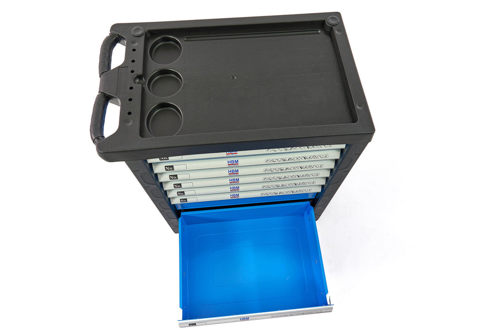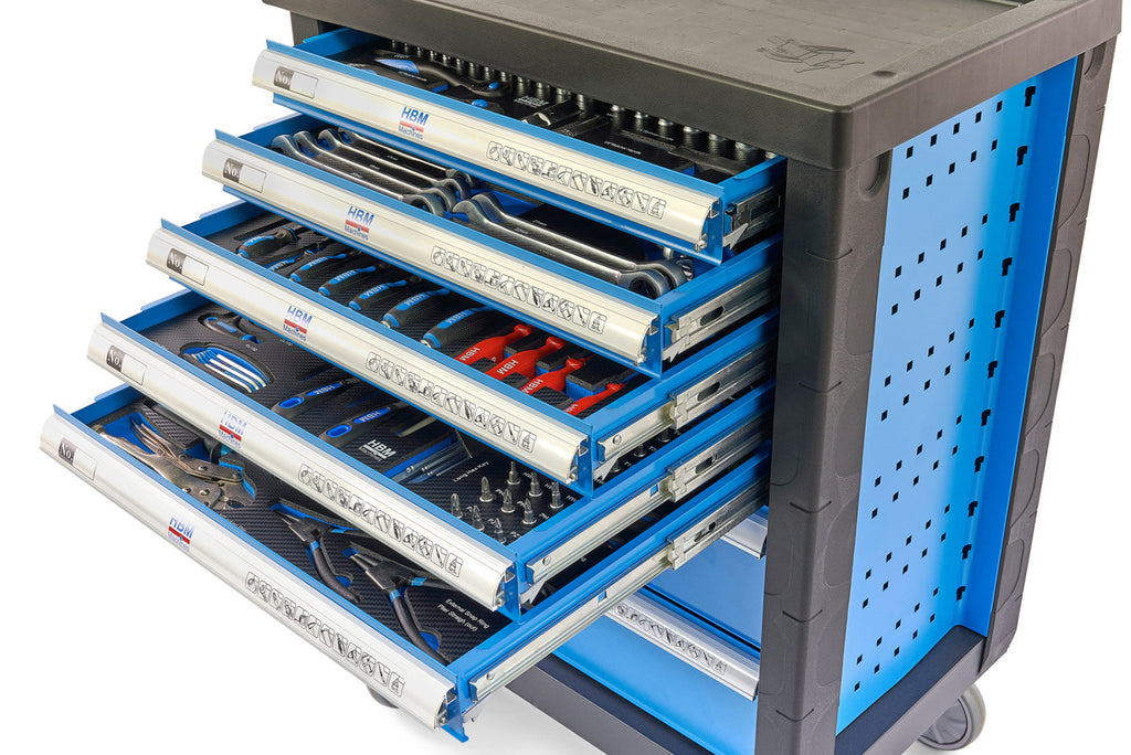 TÁTO PROFESIONÁLNA SKRIŇA NA NÁRADIE HBM SO 7 ZÁSUVKAMI, 196 KUSMI, 5 MODULMI – PREMIUM, HOLANDSKO je ideálna pre každú dielňu alebo garáž. Skrinka má 7 zásuviek vybavených rôznymi dielmi.