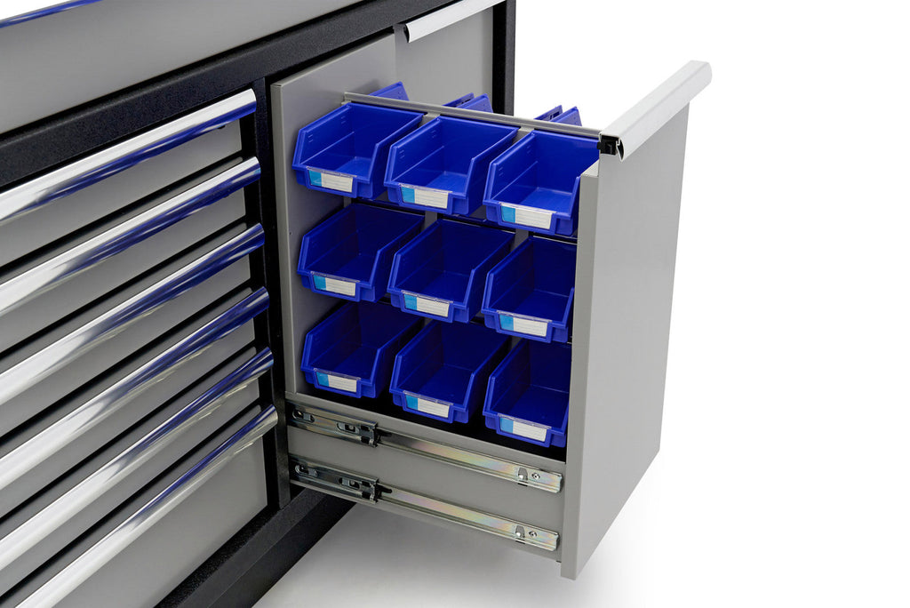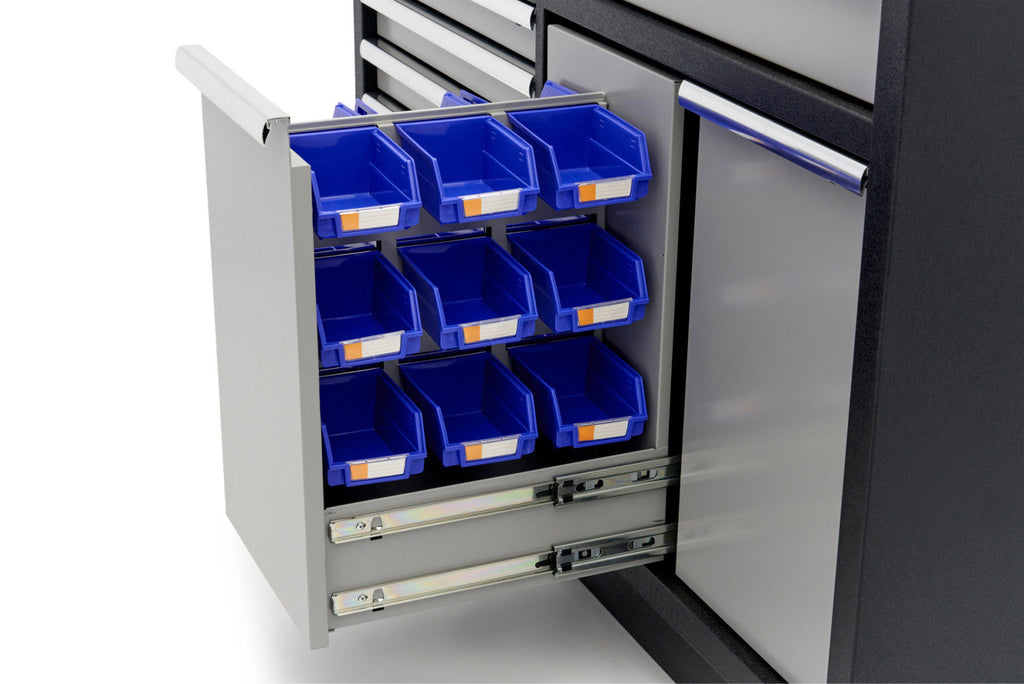 Má 9 zásuviek, z toho: 5 štandardných zásuviek a 1 hlbšiu zásuvku. Vpravo dole sú dve väčšie zásuvky. Jedna z nich je určená ako priečinok na odpad a druhá ponúka priestor pre 18 úložných boxov.