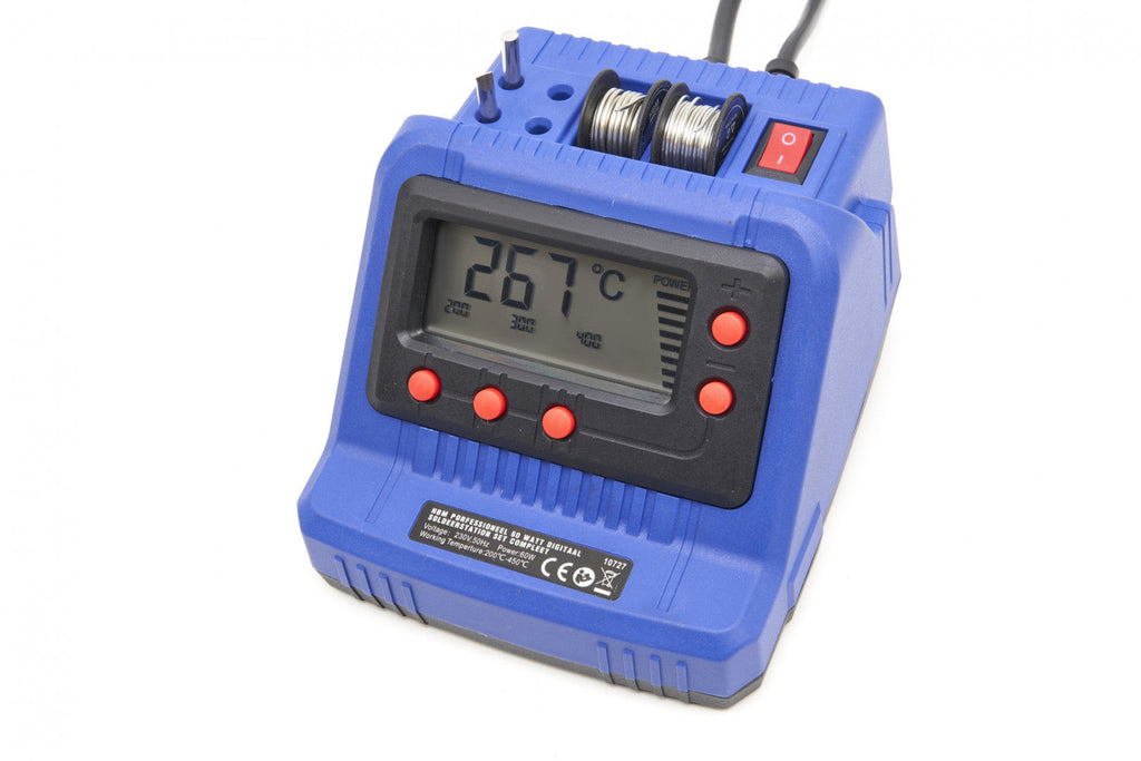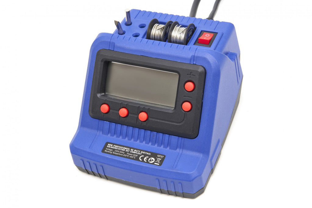 TÁTO PROFESIONÁLNA SPÁJKOVACIA STANICA 60W HBM je užitočné zariadenie na profesionálne spájkovacie práce. Je možné nastaviť vhodnú teplotu na spájkovanie medzi 200 a 450 stupňami. LCD displej zobrazuje teplotu. Príslušenstvo možno jednoducho uložiť do špeciálne vytvorených priehradiek.