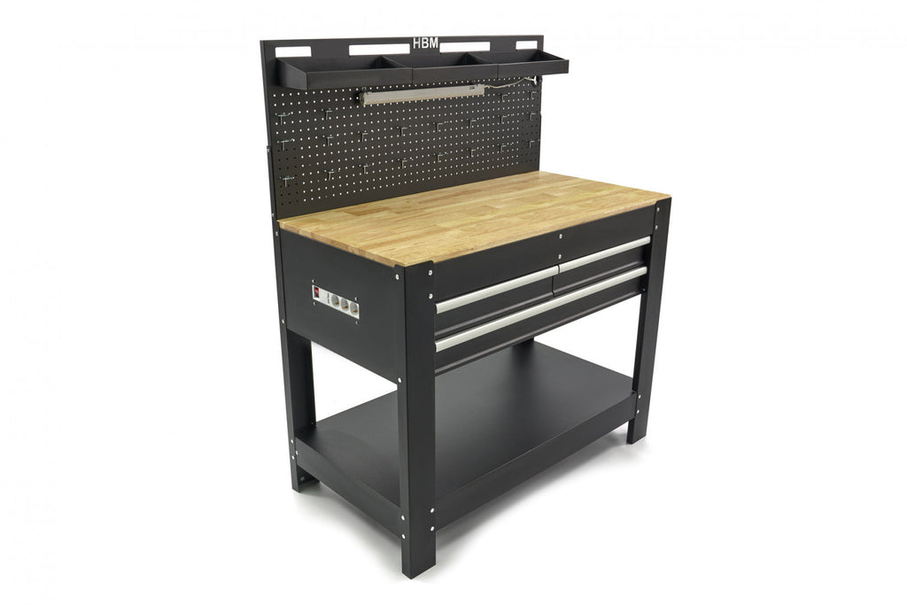 Profesionálny kovový pracovný stôl s 3 zásuvkami, masívnou drevenou pracovnou doskou, LED osvetlením, 230V zásuvkami a USB portom, dĺžka 115cm