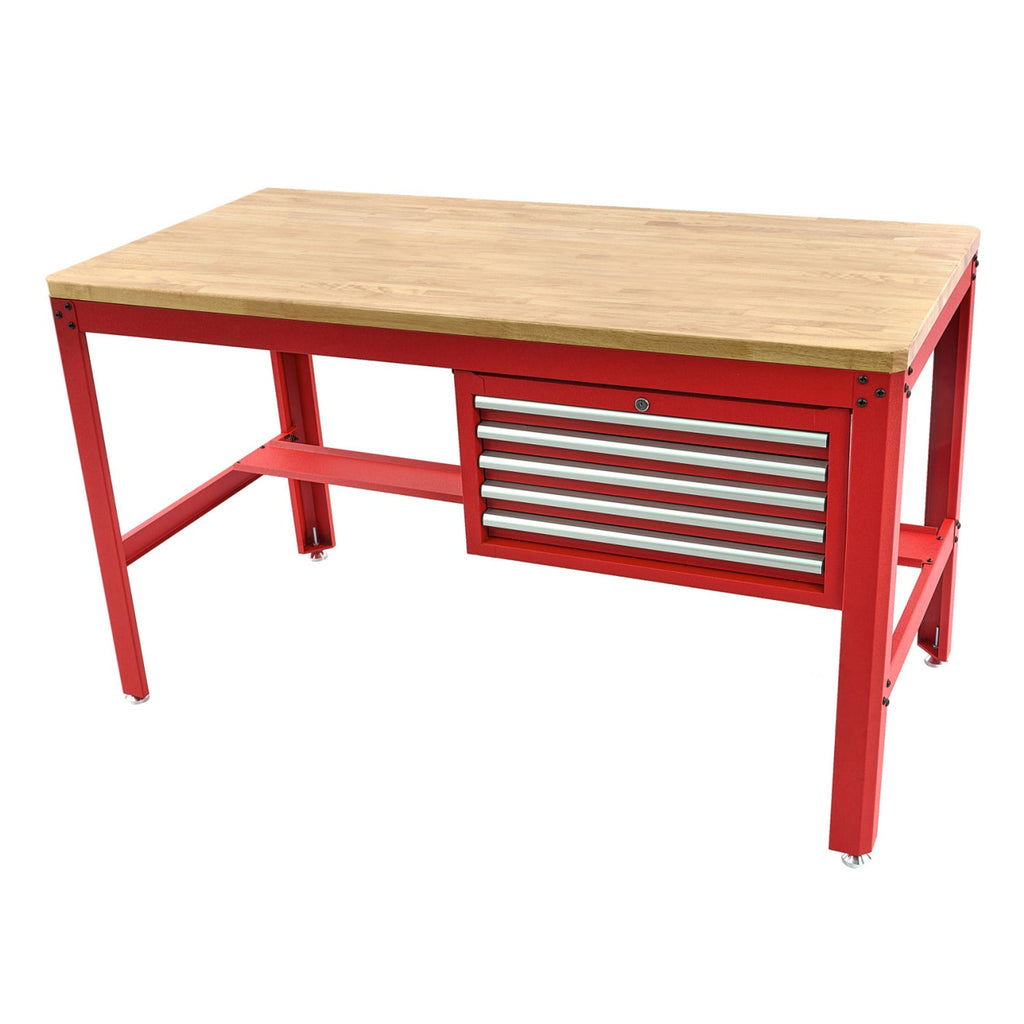 TENTO PROFESIONÁLNY KOVOVÝ PRACOVNÝ STÔL S 5 ZÁSUVKAMI A DREVENOU DOSKOU 155 CM ČERVENÝ je užitočný pre dielne alebo garáže. Rozmery pracovnej dosky sú 156 x 76 cm.
