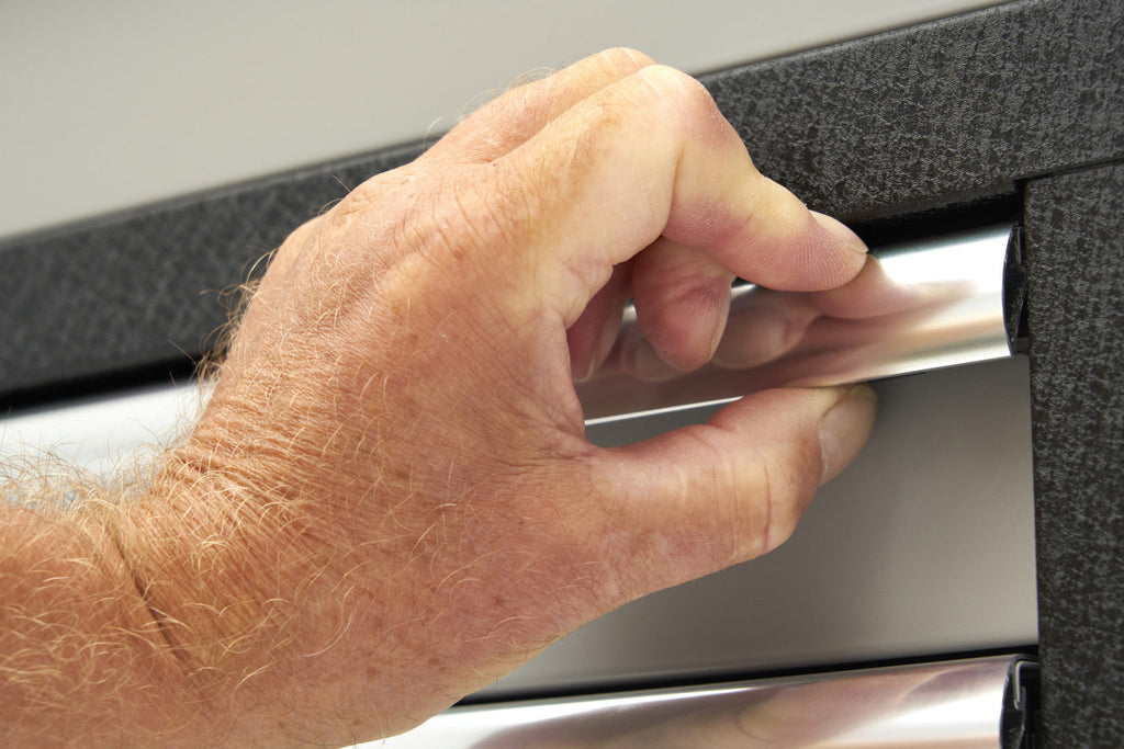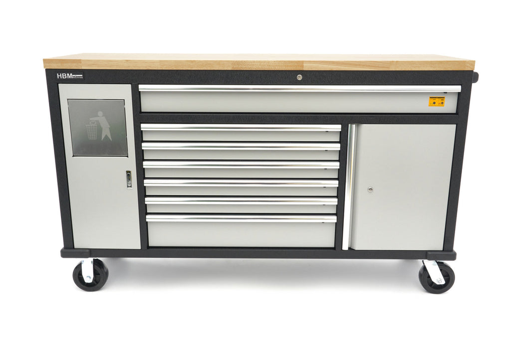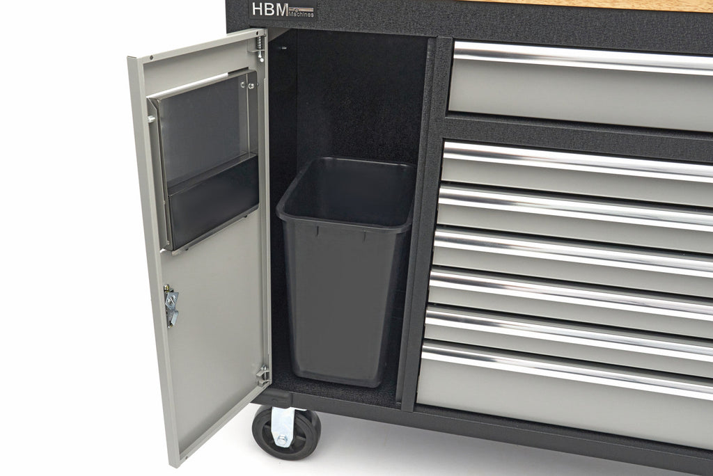 TENTO PROFESIONÁLNY PRACOVNÝ STÔL S 18 ZÁSUVKAMI 168 CM MASÍVNA DREVENÁ DOSKA ZÁSUVKA 220V/USB HBM má dostatok úložných priestorov pre malé aj veľké náradie a praktický odpadkový kôš po ruke.