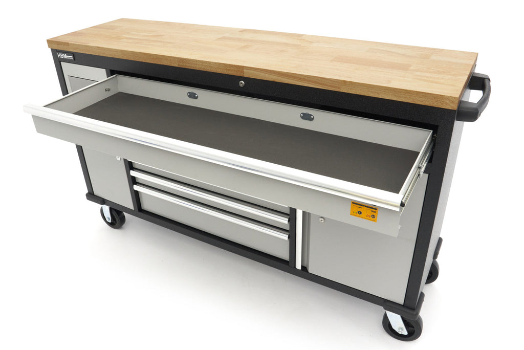 Profesionálny pracovný stôl, pojazdný, s 18 zásuvkami, 168cm, masívna drevená doska, zásuvka 220V / USB, HBM