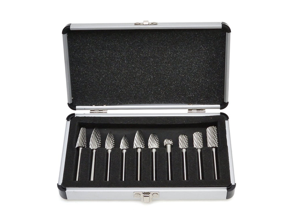 Sada obsahuje 2 valcové frézy (10 mm, 12 mm), 2 frézy s guľatou hlavou (10 mm, 12 mm), 5 kužeľových fréz (13 mm, 12 mm, 11 mm, 10 mm, 10 mm) a jednu frézu s guľovitým hrotom (10 mm). Dĺžka rezných hrán je od 53 do 72 mm. Priemer stopky je 6 mm.