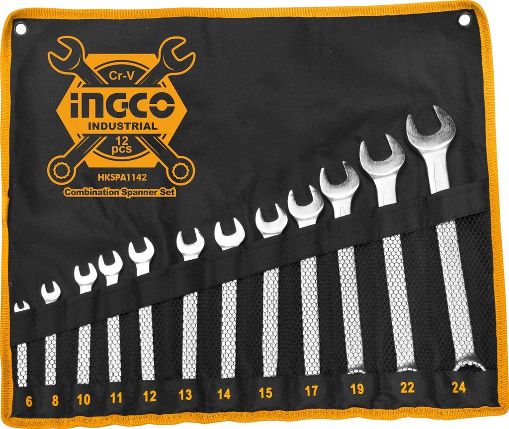 TÁTO SADA 12 KOMBINOVANÝCH KĽÚČOV 6-24MM INGCO obsahuje 12 priemyselných pevných kľúčov vyrobených z ocele.