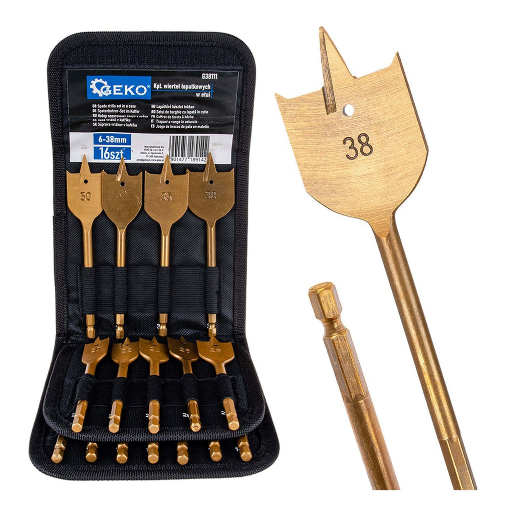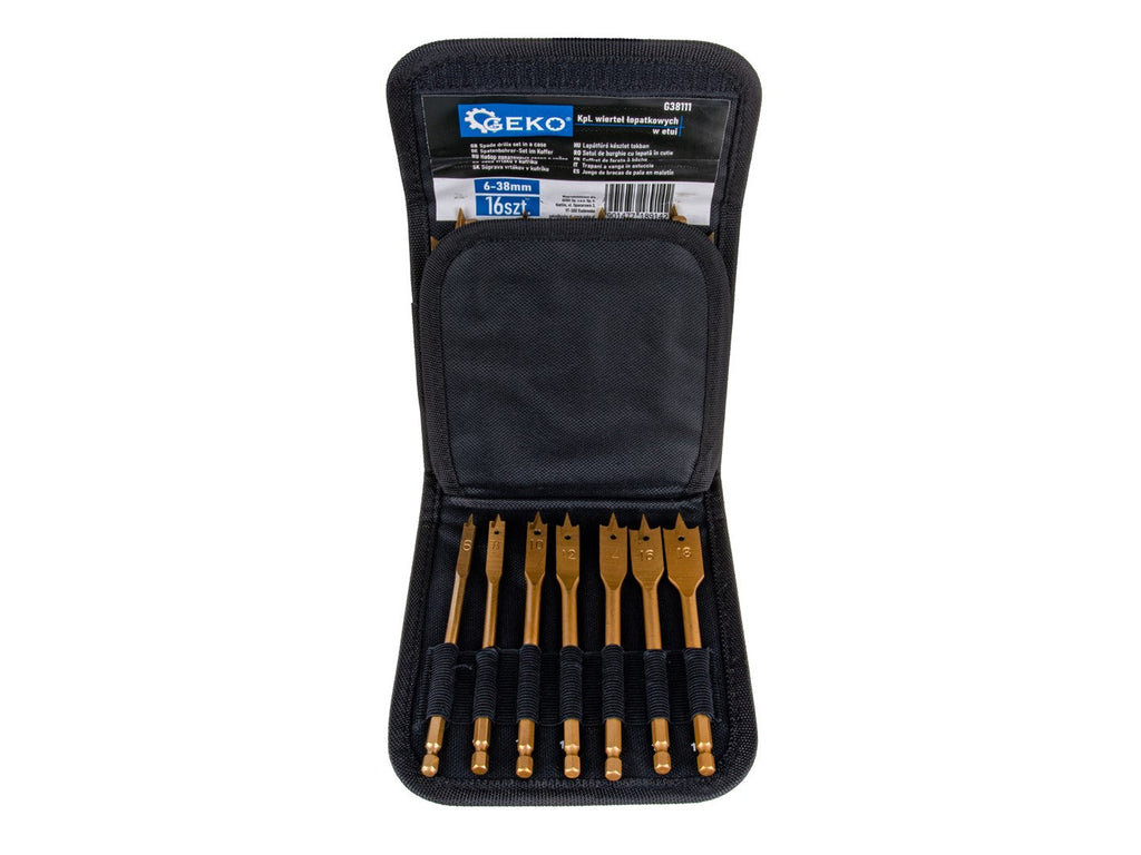 Týchto 16 kusov má široký rozsah veľkostí od 6 mm do 38 mm. Stopka je hexagonálna 1/4”. Dĺžka každého vrtáka je 15 cm. Sada je dodávaná v textilnom púzdre, ideálnom na organizáciu a skladovanie.