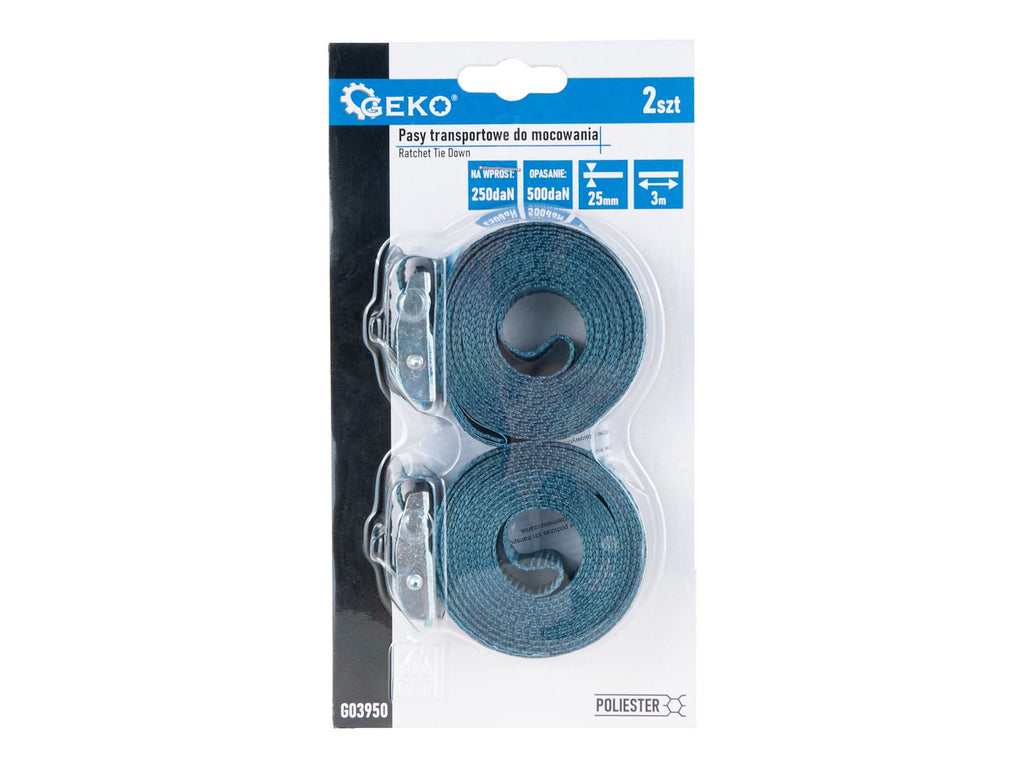 S šírkou 25 mm a dĺžkou 3 metre zabezpečujú stabilné a rovnomerné upevnenie predmetov, čím bránia ich posunutiu. Maximálna upínacia sila je 250 daN (250 kg) a celková pevnosť popruhu je 500 kg. Pracka s automatickým blokovaním vydrží až 250 kg. Popruhy spĺňajú európsku normu EN 12195-2:2000 a sú certifikované TÜV GS.