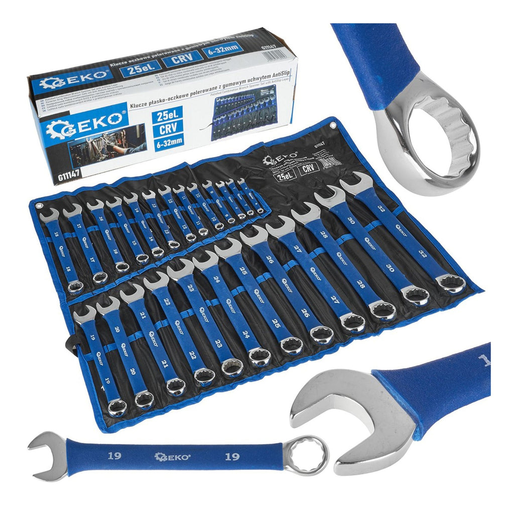 TÁTO SADA 25 PEVNÝCH KOMBINOVANÝCH OČKOVÝCH KĽÚČOV S GUMENOU PROTIŠMYKOVOU RUKOVÄŤOU ANTISLIP 6-32MM je vyrobená z Cr-V ocele a obsahuje kľúče s veľkosťami od 6 do 32 mm. Disponujú gumovou protišmykovou rukoväťou, čo zaručuje bezpečnejšie používanie náradia.