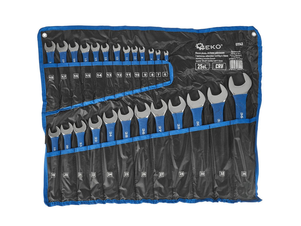 TÁTO SADA 25 PEVNÝCH KOMBINOVANÝCH OČKOVÝCH KĽÚČOV S GUMENOU PROTIŠMYKOVOU RUKOVÄŤOU ANTISLIP 6-36MM je vyrobená z Cr-V ocele a obsahuje kľúče s veľkosťami od 6 do 36 mm. Disponujú gumovou protišmykovou rukoväťou, čo zaručuje bezpečnejšie používanie náradia.