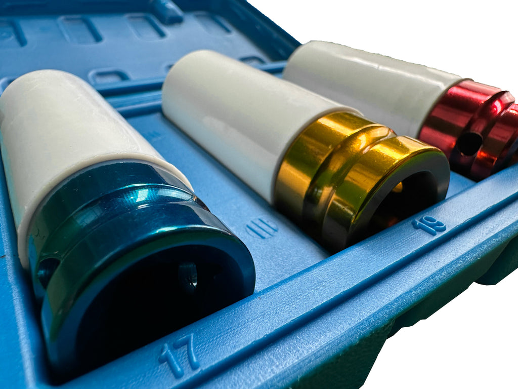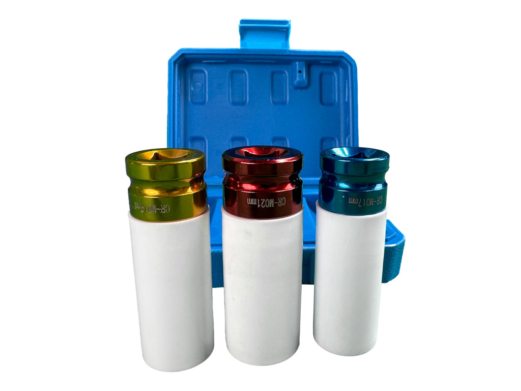 TÁTO SÚPRAVA 3 NÁSTRČNÝCH KĽÚČOV S OCHRANOU PRE HLINÍKOVÉ DISKY 17, 19, 21 MM GEBO TOOLS obsahuje nástavce vyrobené z chróm-vanádiovej ocele a vybavené ochranným povrchom, ktorý chráni hliníkové disky pred poškriabaním. Súprava je určená pre zliatinové kolesá.