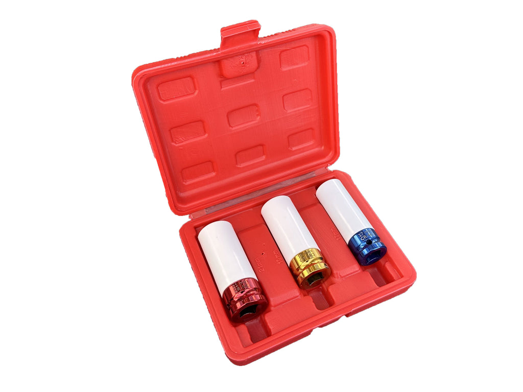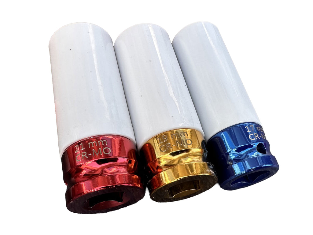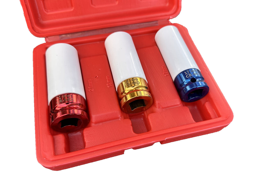 TÁTO SÚPRAVA 3 DLHÝCH RÁZOVÝCH NÁSTRČNÝCH KĽÚČOV S OCHRANOU PRE HLINÍKOVÉ DISKY 17, 19, 21 MM GEBO TOOLS je vyrobená z ocele Cr-V. Súprava obsahuje bežne používané veľkosti 17 mm, 19 mm a 21 mm, pričom každá hlavica je vybavená ochranným obalom, ktorý zabraňuje poškriabaniu alebo poškodeniu zliatinových diskov počas montáže alebo demontáže.