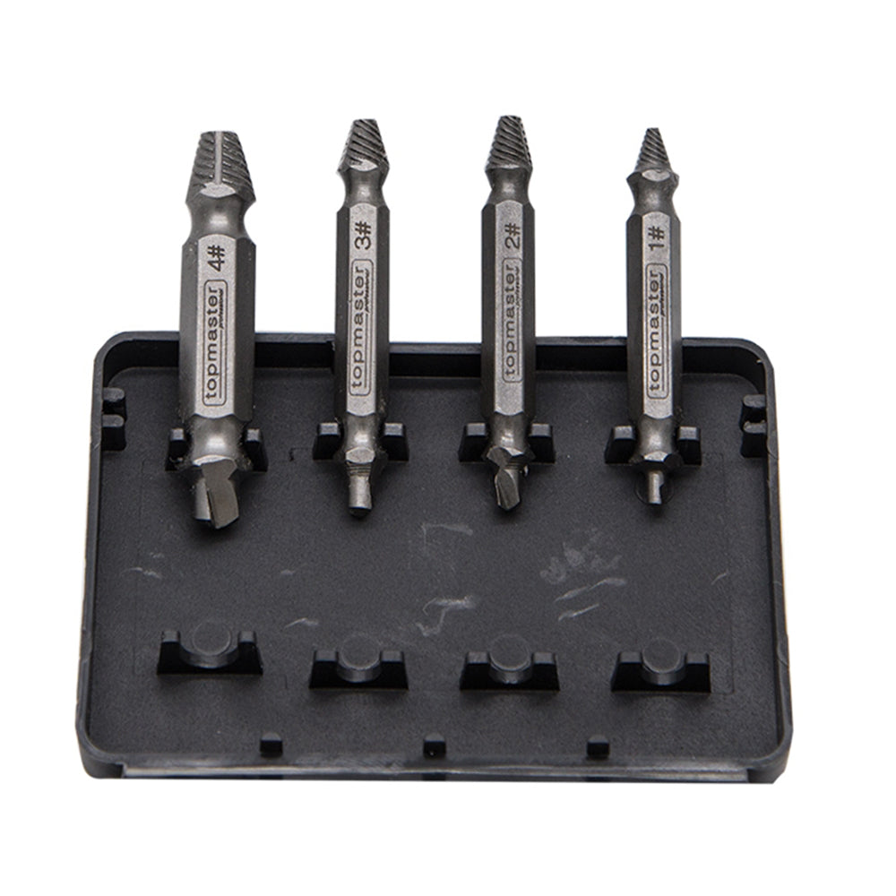TÁTO SADA 4 VYŤAHOVAČOV NA OPOTREBOVANÉ A ZLOMENÉ SKRUTKY TOPMASTER sa používa na vyťahovanie alebo uvoľňovanie skrutiek a skrutiek so závitom vpravo.