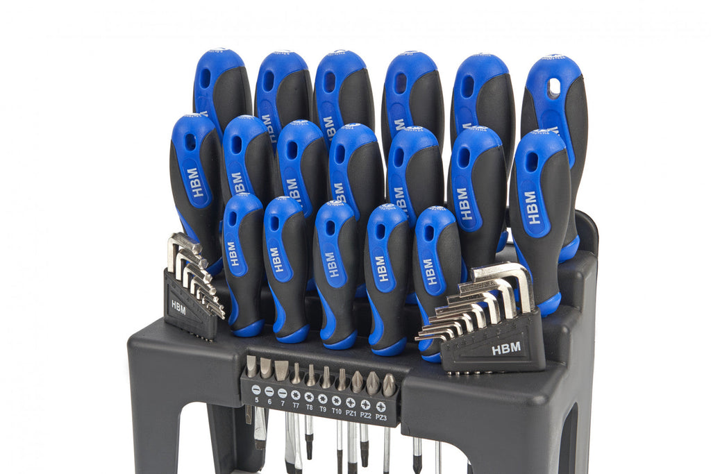 Táto SADA 44 SKRUTKOVAČOV HBM obsahuje 44 skrutkovačov vybavených mäkkými protišmykovými ergonomickými rukoväťami, dodávaných v odolnom špeciálnom stojane.