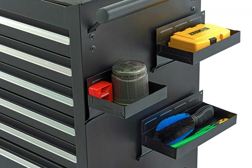 TÁTO SÚPRAVA 4 MAGNETICKÝCH POLÍC PRE SKRIŇU NA NÁRADIE – ČIERNA, BOČNÁ ORGANIZÁCIA, UNIVERZÁLNA, HBM HOLANDSKO obsahuje 4 kovové nádoby, ktoré možno jednoducho pripevniť pomocou magnetov. Zadná časť má výšku 12 cm, je vybavená magnetmi a gumovým pásom.