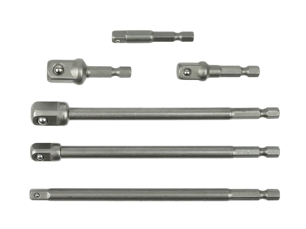 TÁTO SADA 6 ADAPTÉROV NA HLAVICE obsahuje adaptéry pre pripojenia 1/4"", 3/8"", 1/2"" s dĺžkami 150 mm a 50 mm. Vyrobená z chróm-vanádiovej (CrV) nástrojovej ocele, s HEX rukoväťou 1/4”.
