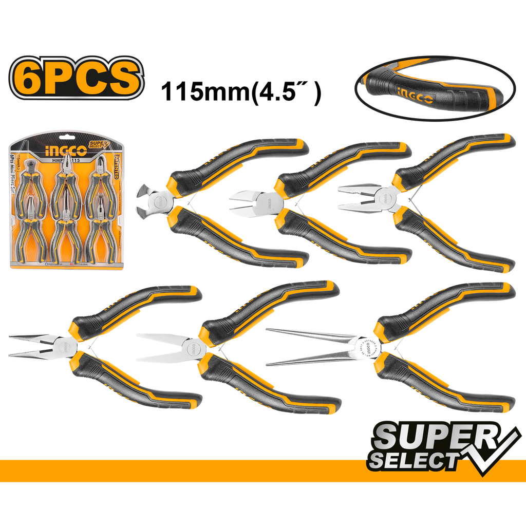 TÁTO SADA 6 MINI KLIEŠŤOV TYPU PATENT CR-V 115MM INGCO je ideálna na prácu v ťažko prístupných miestach. Sada je určená na inštaláciu a opravu presných nástrojov alebo súčiastok v úzkych priestoroch, perfektná na rôzne úlohy uchopenia alebo strihania. Rukoväť je potiahnutá gumou pre väčší komfort pri používaní. Telo klieští je vyrobené z vysoko kvalitnej CR-V ocele s tepelnou úpravou, vyššou tvrdosťou a dlhou životnosťou.