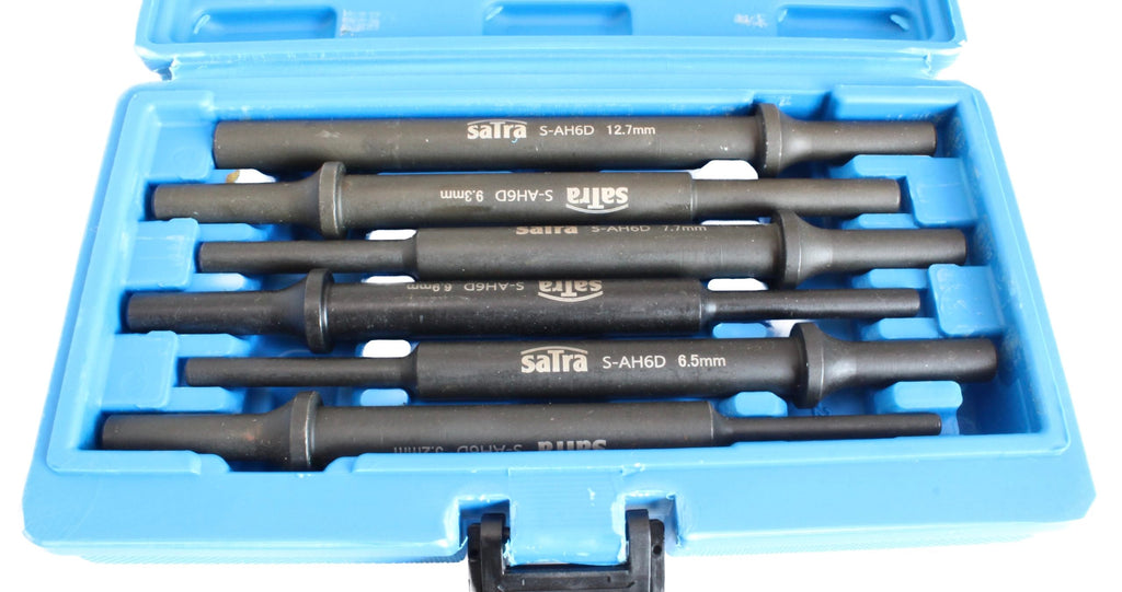 TÁTO SADA 6 VYRAŽAČOV PRE PNEUMATICKÉ DLÁTO je určená na odstraňovanie zhrdzavených skrutiek, hriadeľov, kolíkov a pod. Vďaka materiálu, z ktorého je vyrobená, zaisťuje vysokú odolnosť a dlhú životnosť. Štandardná rukoväť pasuje do väčšiny pneumatických kladív.