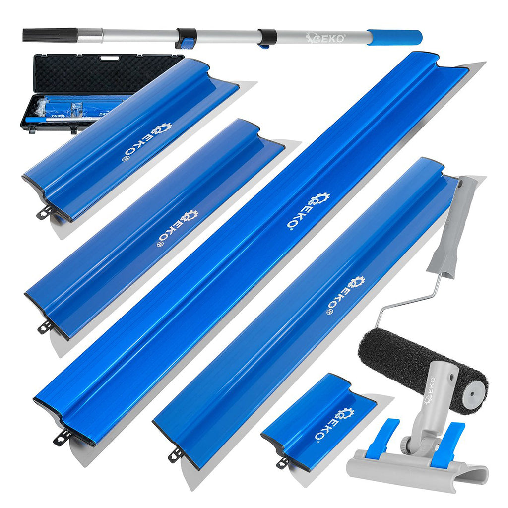 Táto SADA FINIŠOVACÍCH HLADIDIEL NA STENY A STROPY 9 KS GEKO je dodávaná v pevnej krabici s rozmermi 120 x 32 x 12 cm s penovou ochrannou vložkou. Sada obsahuje finišovacie hladidlá určené na nanášanie a vyhladzovanie spojovacieho tmelu. Hladilá majú šírky 25 cm, 40 cm, 60 cm, 80 cm a 100 cm, plastové telo a vymeniteľnú čepeľ s hrúbkou 0,3 mm.