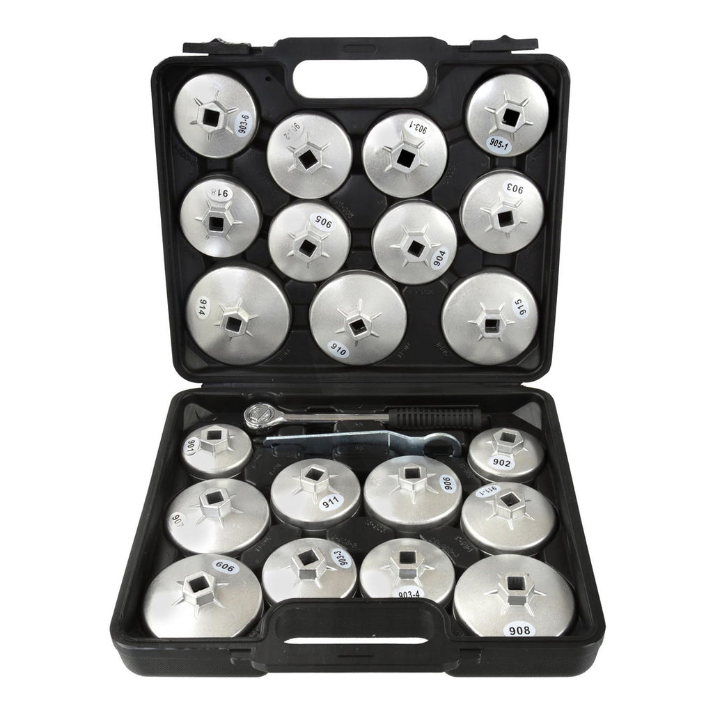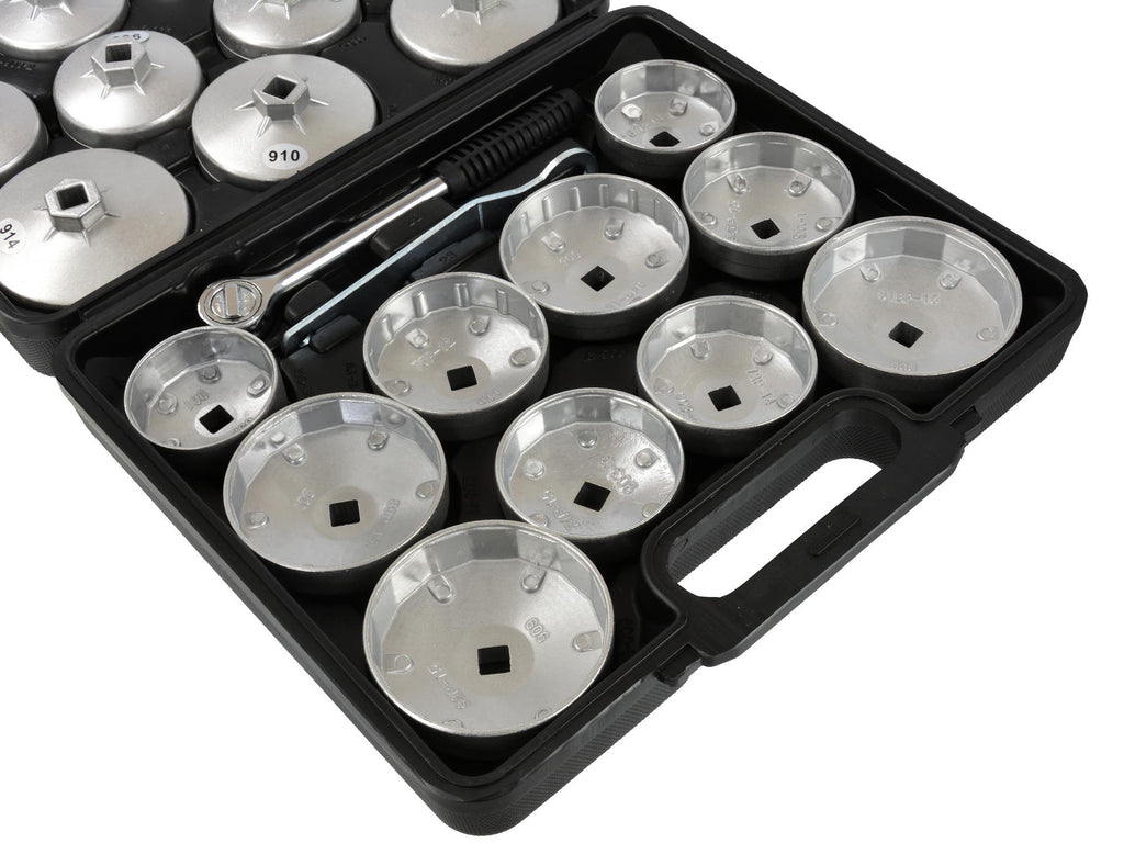 SADA KĽÚČOV NA VÍKO OLEJOVÉHO FILTRA Z HLINÍKA 23 KS je vhodná na demontáž olejových filtrov rôznych veľkostí.