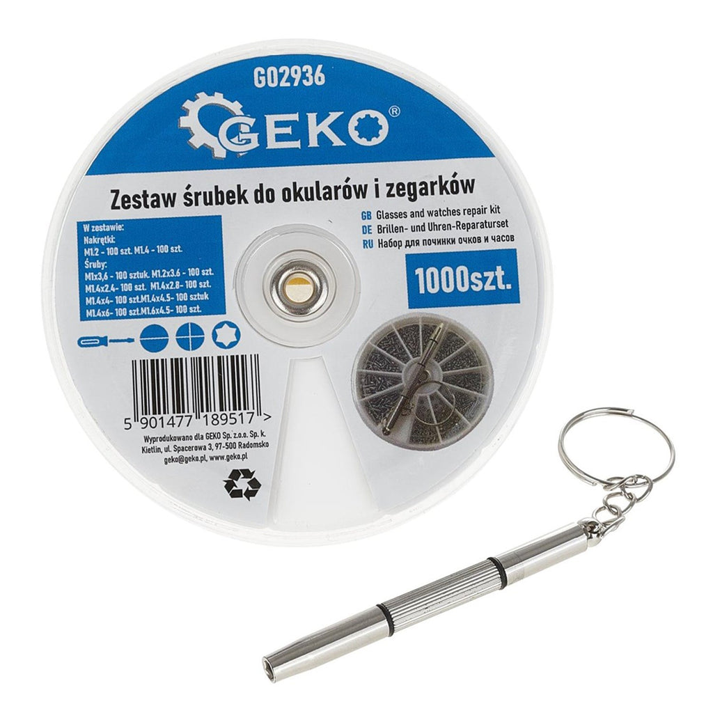 TÁTO SADA HODINÁRSKYCH A OPTICKÝCH SKRUTIEK SO SKRUTKOVAČOM 1000 KS GEKO je špeciálne navrhnutá na údržbu a opravu okuliarov, hodiniek a iných presných zariadení. Sada obsahuje skrutky a matice rôznych veľkostí. Malý skrutkovač vo forme prívesku umožňuje vykonávať drobné opravárske práce.