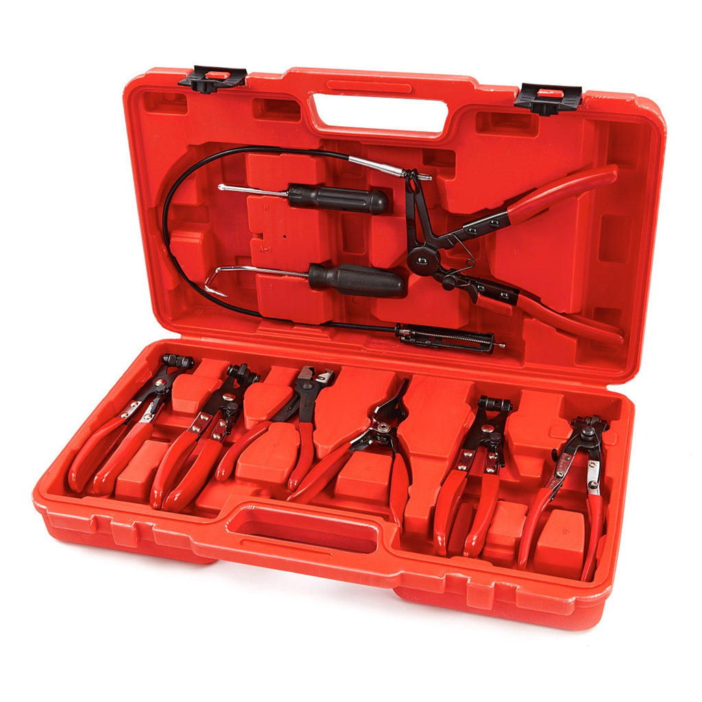 Táto SÚPRAVA KLIEŠŤOV NA SVORKY VODNÝCH HADÍC, 9 KS je určená na montáž a demontáž svoriek na vodných hadiciach s rozmermi od 18 do 54 mm. Obsahuje 7 rôznych typov klieští na rôzne aplikácie. Pre ťažko dostupné miesta je možné použiť bowdenové lanko ako predĺženie. Kliešte sú vybavené blokovacou funkciou, ktorá umožňuje uvoľniť ruky pre ďalšie práce.