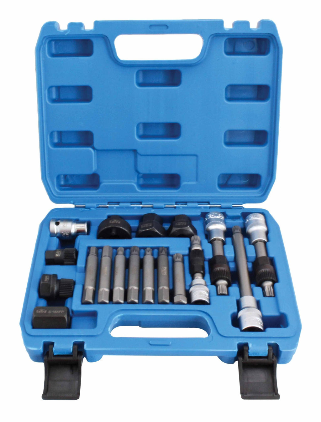 SADA KLÚČOV NA MONTÁŽ DEMONTÁŽ REMENÍC ALTERNÁTORA AUTO, UNIVERZÁLNA, 18 KUSOV SATRA je ideálna na demontáž alebo montáž remeníc automobilových alternátorov. Diely z tejto sady sú prispôsobené pre VW, Audi, Seat, Mercedes-Benz, Renault, BMW alebo Fiat. V sade sú zahrnuté kľúče na alternátor a bity.