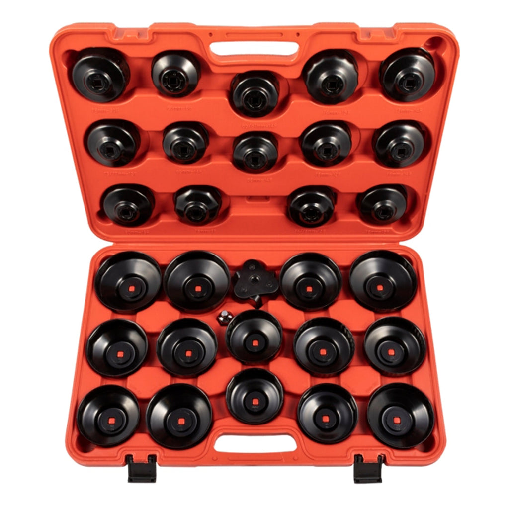 SADA NA DEMONTÁŽ VÍK OLEJOVÉHO FILTRA 30 KS obsahuje 28 nadstavcov pre filtre rôznych rozmerov, kľúč na olejový filter 3/8” a adaptér 1/2” x 3/8”. Je určená pre profesionálne aj hobby použitie pri údržbe a výmene olejových filtrov.