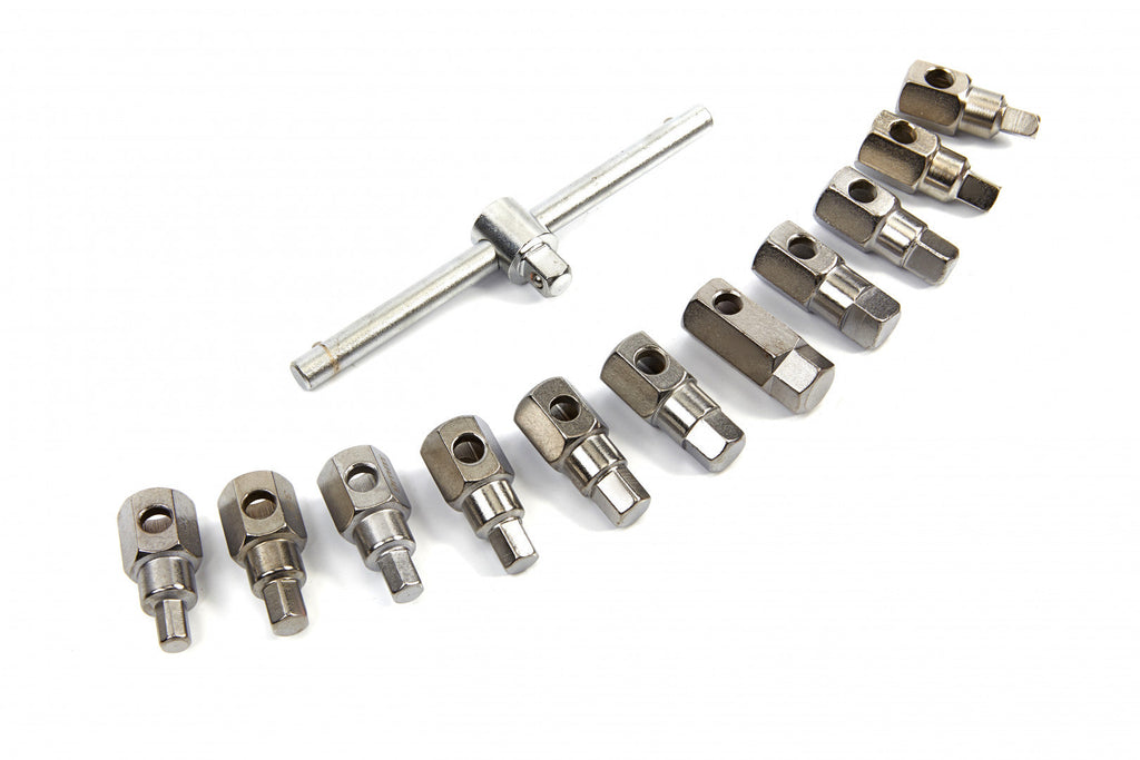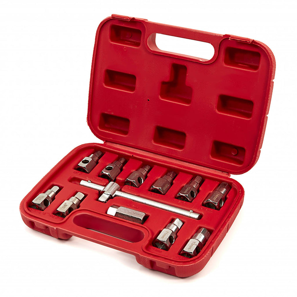 SADA KĽÚČOV NA VYPÚŠŤACIE ZÁTKY OLEJOVEJ VANE 12 KUSOV je nevyhnutným príslušenstvom na uťahovanie alebo povoľovanie skrutiek a matíc. Kľúče sú vyrobené z chróm-vanádiovej ocele, čo zaručuje trvácnosť a vysokú odolnosť.