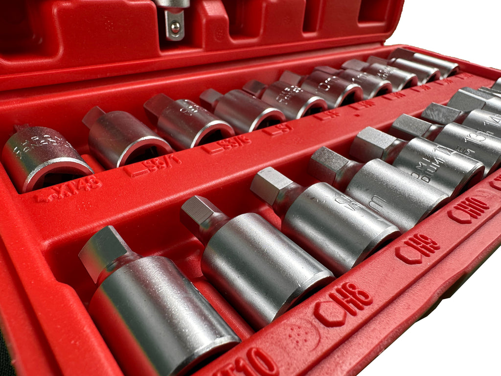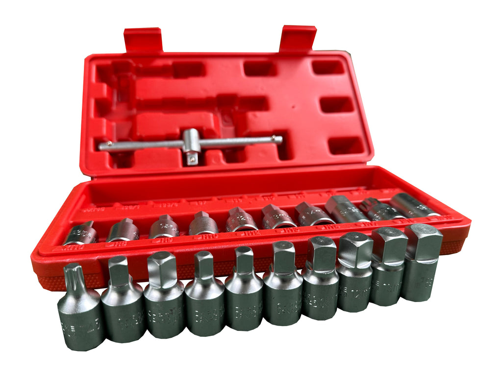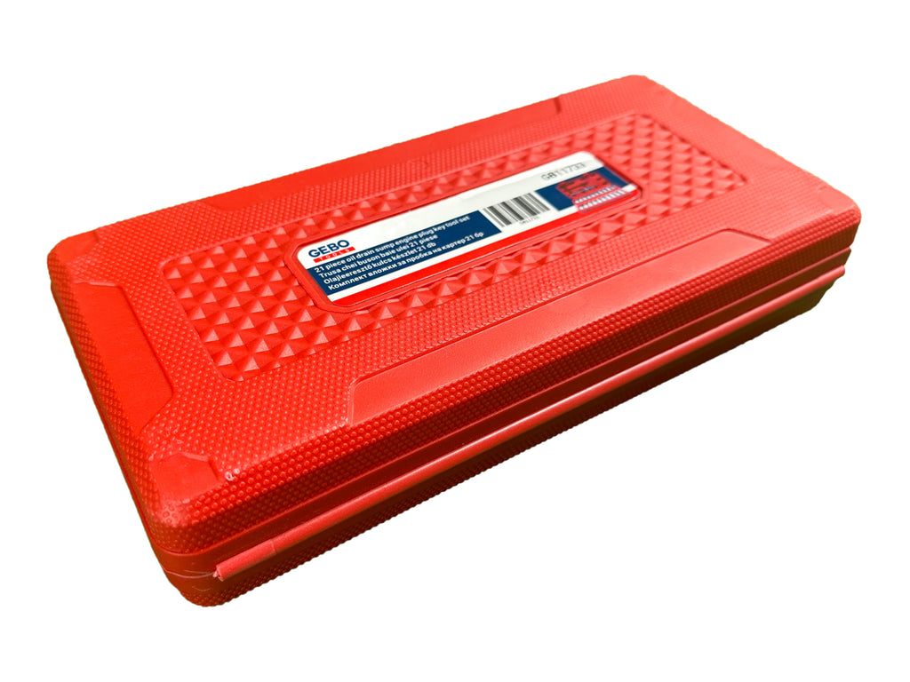 SADA KĽÚČOV NA VYPÚŠŤACIE ZÁTKY OLEJOVEJ VANE 21 KUSOV GEBO TOOLS obsahuje 3 šesťhranné hlavice XT10, 4 šesťhranné hlavice S7-S14, 6 šesťhranných hlavíc H8-H17, 6 hviezdicových hlavíc XT45, 12 šesťhranných hlavíc M16, skrutku XS10 štvorcovú a predlžovaciu pákovú rukoväť 3/8".