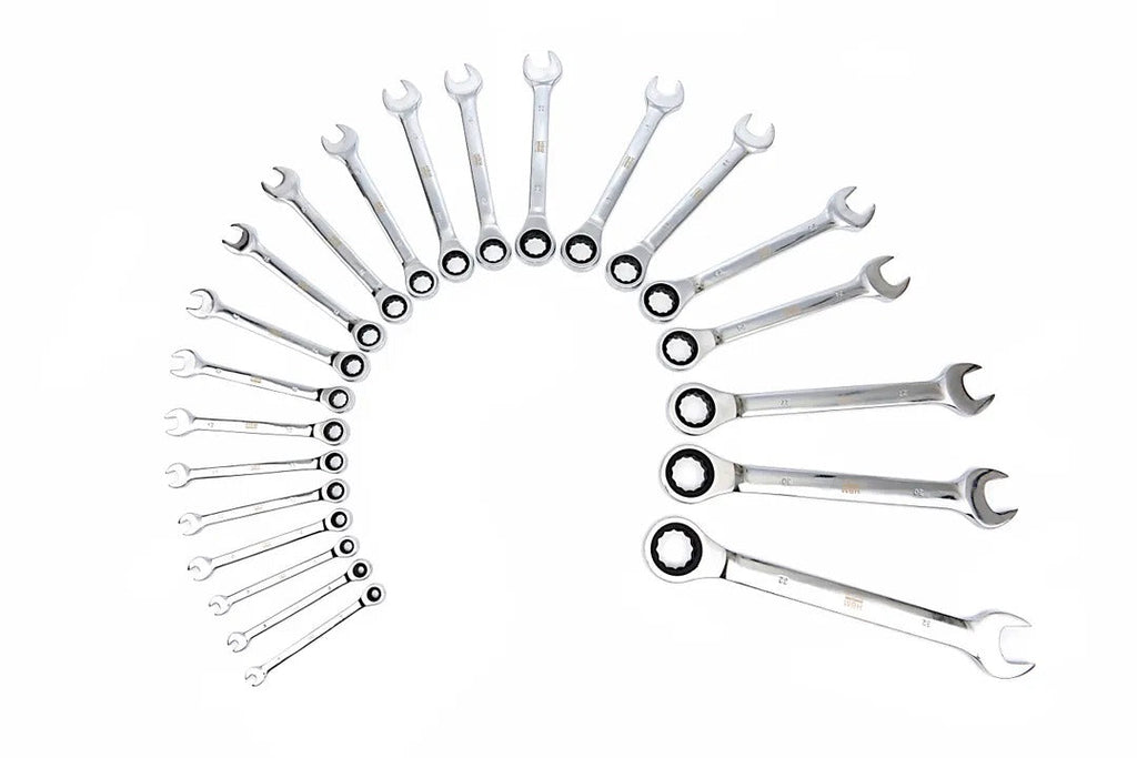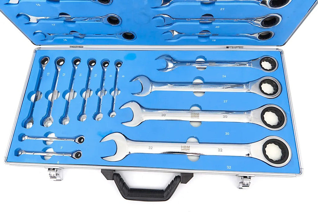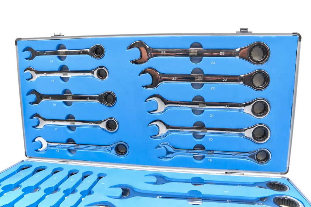 SADA KOMBINOVANÝCH KĽÚČOV S RAČŇOU 6-32 MM 22 KUSOV HBM obsahuje 22 kusov s veľkosťami od 6 do 32 mm. Každý kľúč má na jednej strane otvorenú hlavu a na druhej strane hlavu s račňovým mechanizmom, čo ho robí vhodným pre rôzne mechanické práce. Kľúče sú vyrobené z ocele, čo zaručuje odolnosť a trvácnosť pri používaní. Sada je dodávaná v kompaktnom kufríku, ktorý umožňuje jednoduchú organizáciu a prepravu náradia.