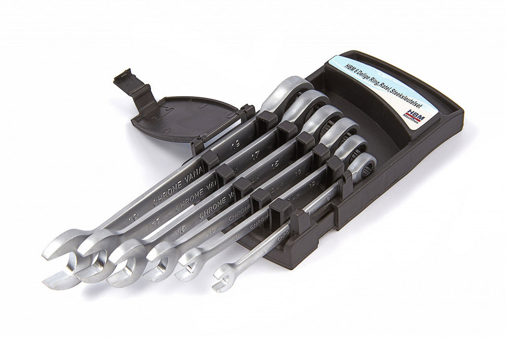 TÁTO SADA KOMBINOVANÝCH KĽÚČOV S RAČŇOU 8-19MM HBM obsahuje 6 kusov kľúčov, ktoré sú uložené v plastovom organizéri.