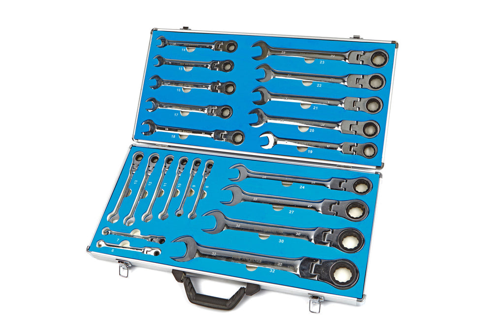 SADA KOMBINOVANÝCH KĽÚČOV S RAČŇOU A KĹBOM 6-32 MM 22 KUSOV je vyrobená z kvalitnej ocele pre dlhú životnosť. Súprava je dodávaná s hliníkovým kufríkom s mäkkou penovou vložkou, ktorá udržiava kľúče v bezpečí. Súprava je zložená z najpoužívanejších kľúčov vybavených račňou a kĺbom.