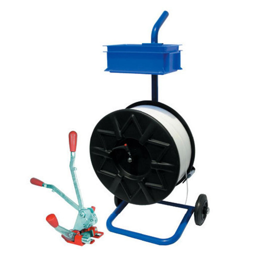 TÁTO SADA KOVOVÉHO VOZÍKA PRE PP PÁSKU, SVORKY A ZARIADENIE NA VIAZANIE PP PÁSKY je praktická, pretože umožňuje aj prepravu pomocou koliesok. Sada je užitočná na upevnenie polypropylénovej pásky okolo predmetov.