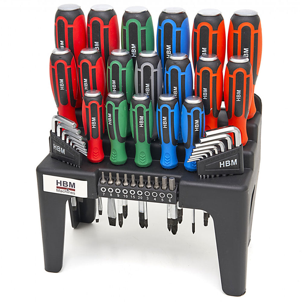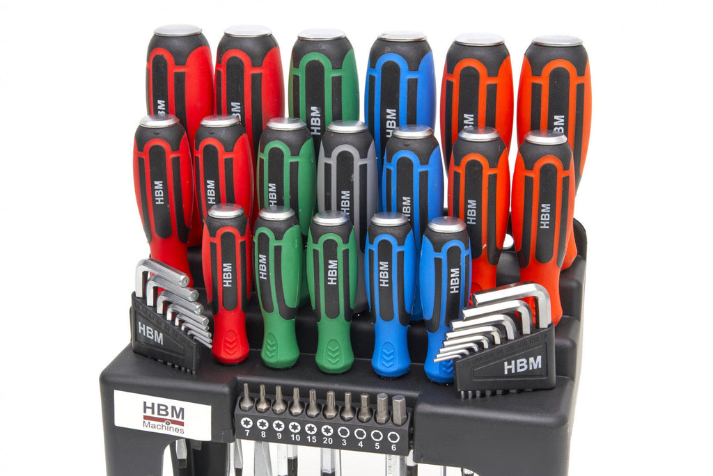 Táto SADA MECHANICKÝCH SKRUTKOVAČOV 44 KS HBM je vyrobená z kvalitných materiálov a je vybavená protišmykovými, ergonomickými rukoväťami pre bezpečný a pohodlný úchop. Dá sa uložiť vďaka stojanu.