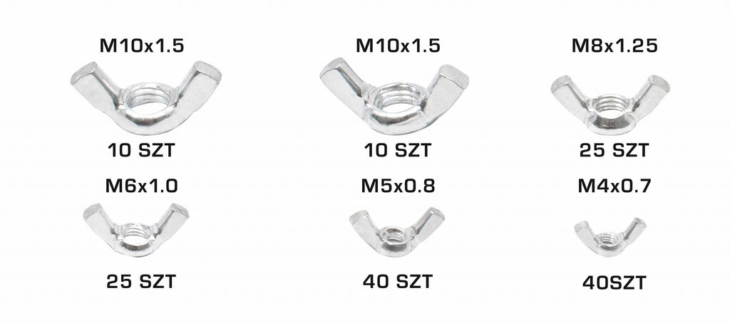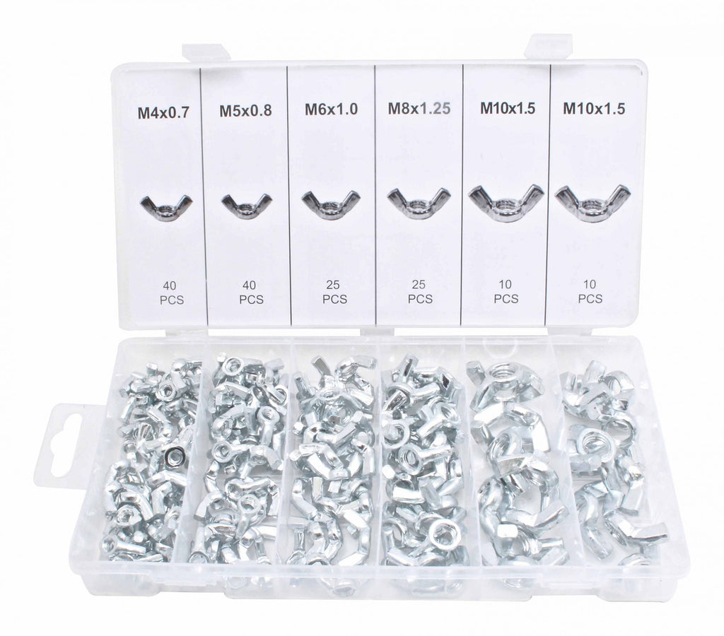 TÁTO SADA KRÍDLOVÝCH MATÍC 150 KUSOV M4–M10 je vhodná na uťahovanie, upevňovanie a fixáciu rôznych prvkov. Obsahuje krídlové matice v nasledujúcich veľkostiach: M4 x 0,7 mm (40 ks), M5 x 0,8 mm (40 ks), M6 x 1,0 mm (25 ks), M8 x 1,25 mm (25 ks) a M10 x 1,5 mm (20 ks). Prvky sú vyrobené z uhlíkovej ocele s pozinkovanou povrchovou úpravou, ktorá poskytuje zvýšenú ochranu proti korózii a opotrebovaniu.
