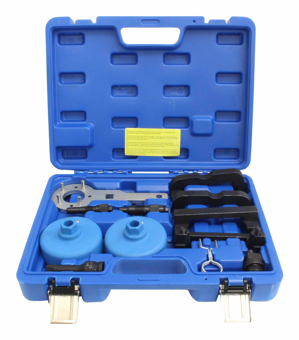 SADA NA BLOKOVANIE A NASTAVENIE ROZVODOV VW AUDI VAG 2.4 2.8 3.0 BENZÍN je určená na nastavenie a reguláciu časovania benzínových motorov 2.4, 2.8, 3.0 zo skupiny VAG. Súprava obsahuje základné nástroje, ako sú blokovacie prípravky pre vačkové hriadele a napínač reťaze, nástroje na montáž remenice kľukového hriadeľa a jej opracovanie, ako aj špeciálne nastavovacie kľúče a dva rúrkové kľúče XZN 14 mm s rôznou dĺžkou (45 mm a 80 mm).