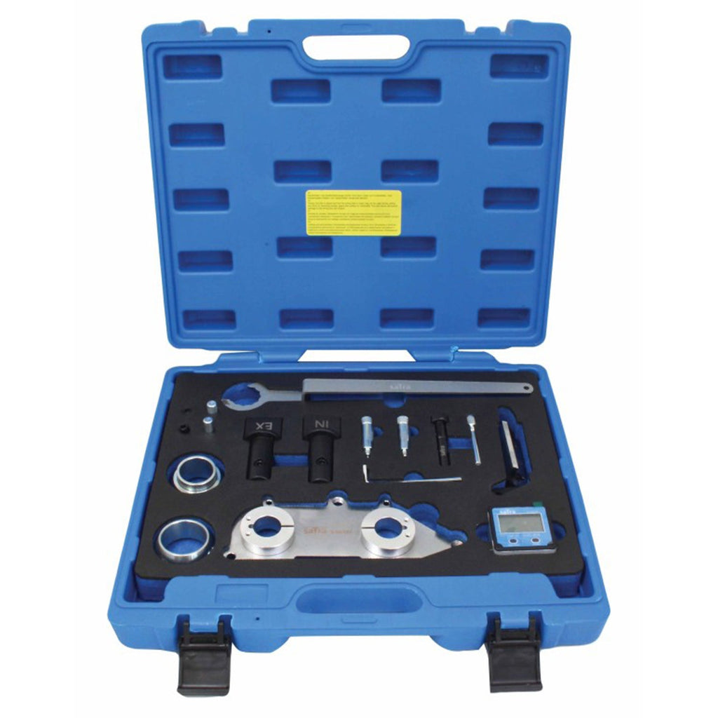 SADA NA BLOKOVANIE A NASTAVENIE ROZVODU 1.5 TSi VW AUDI SEAT SKODA VAG je určená na nastavovanie, zarovnávanie a kontrolu vačkového hriadeľa pri vozidlách vybavených benzínovými motormi 1.5 TSi VAG so štyrmi valcami a systémom ACT. Súprava umožňuje vykonať nastavenie bez potreby použitia počítačových nástrojov na polohovanie vačkového hriadeľa. Pomocou digitálneho merača a priložených adaptérov je možné presné nastavenie bez zásahu do systému OBD, pokiaľ sa postup vykoná správne.