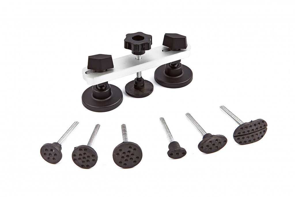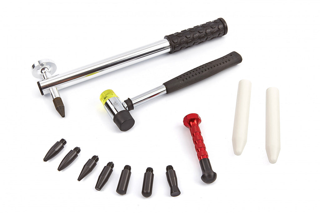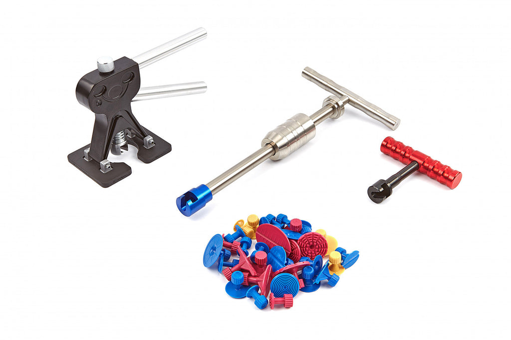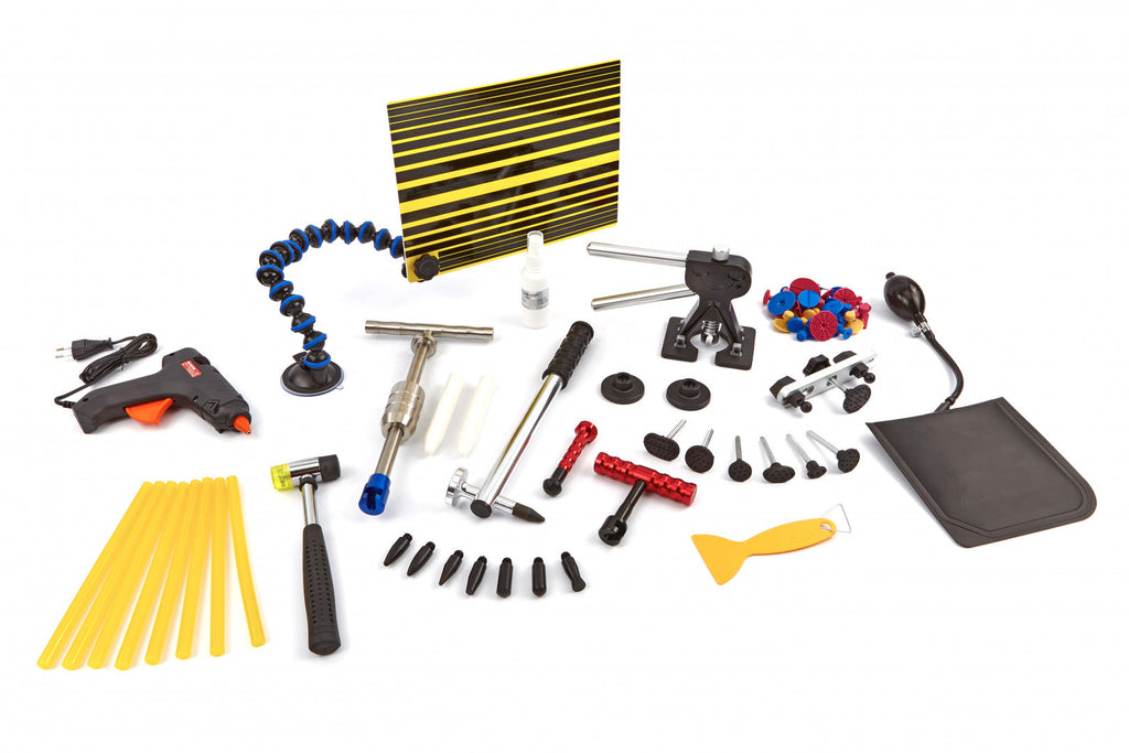 TÁTO SÚPRAVA NA JEMNÉ NÁRAZY 52 KUSOV je ideálna na narovnávanie preliačin spôsobených krupobitím. Súprava obsahuje vzduchový vankúš na otváranie dverí/okien, lepiacu pištoľ, ťahací lis, fľaštičku na alkohol, náplne do lepiacej pištole a posuvné úderové kladivo.