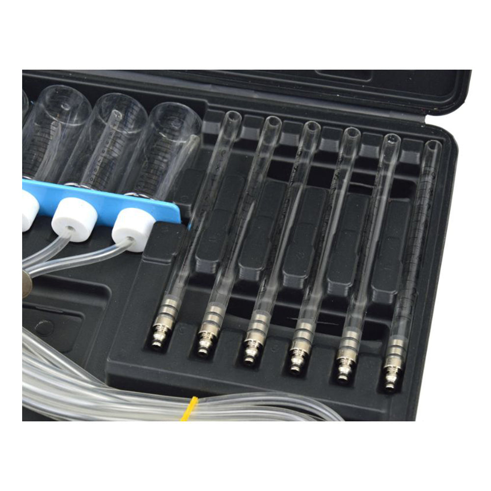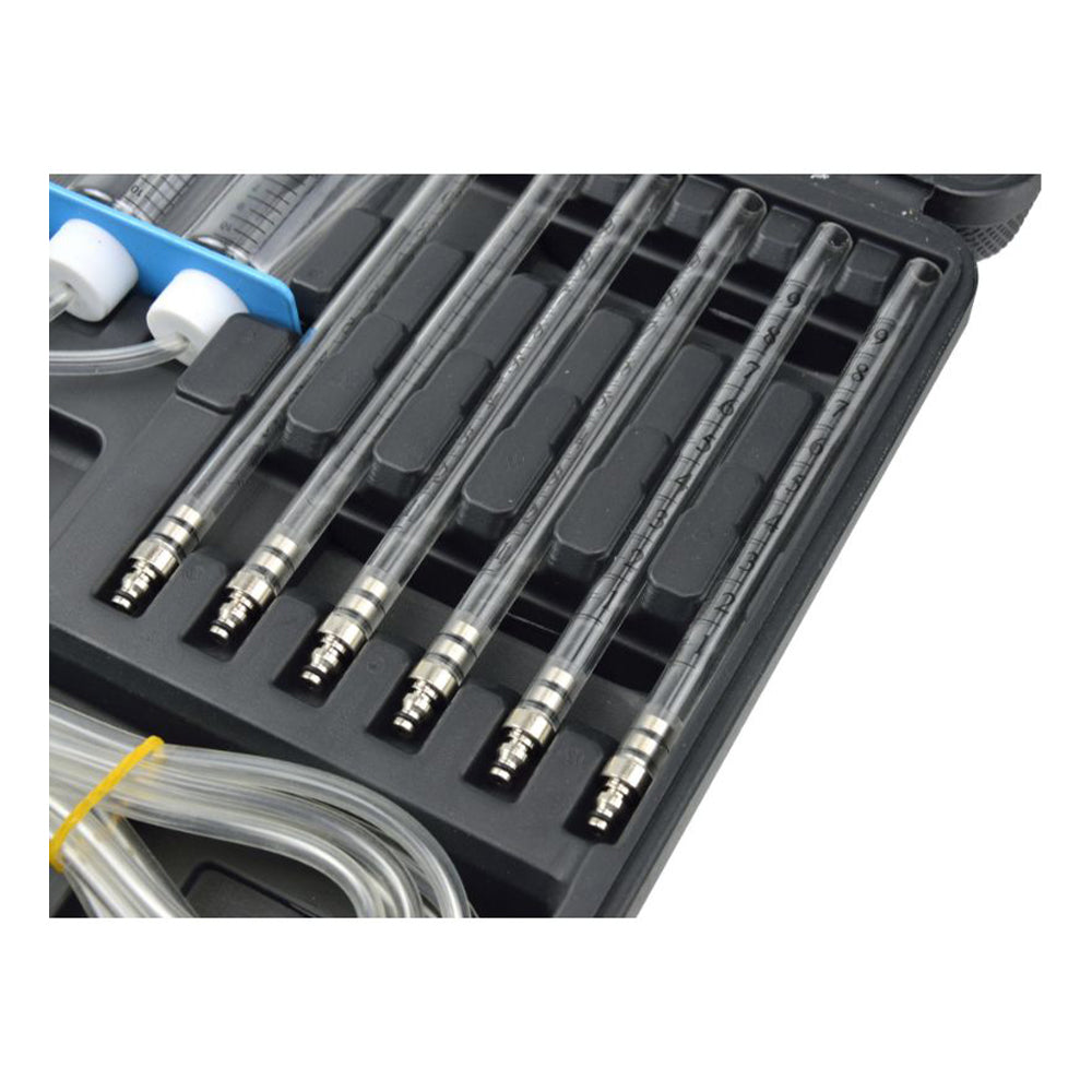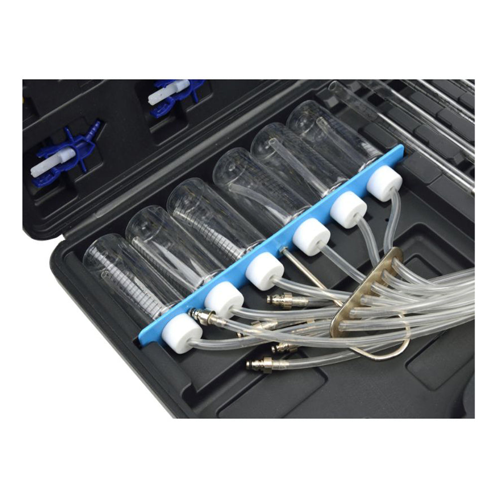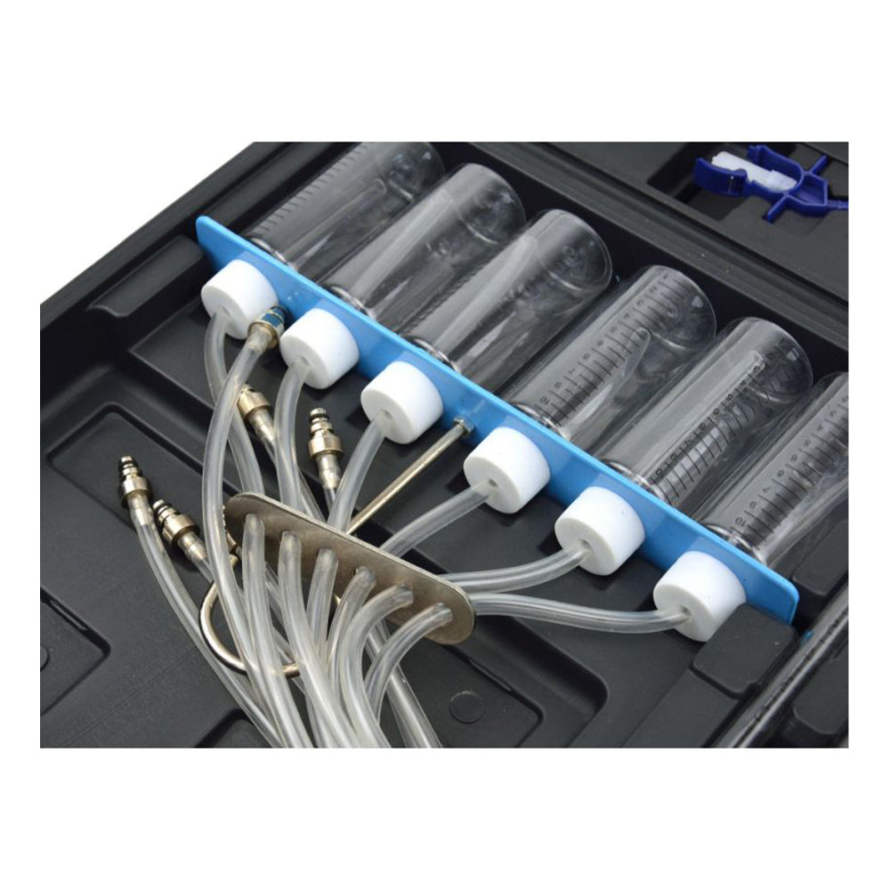 SÚPRAVA NA KONTROLU STRÁT NÁVRATU PALIVA sa používa na testovanie väčšiny palivových systémov s vysokotlakovými čerpadlami Common Rail. Zariadenie sa používa na rýchle a efektívne meranie objemu paliva pri odtoku každého vstrekovača. Táto súprava umožňuje súčasné meranie na 6 vstrekovačoch.