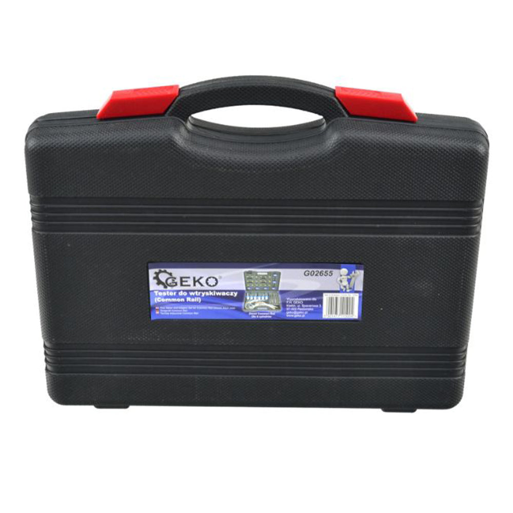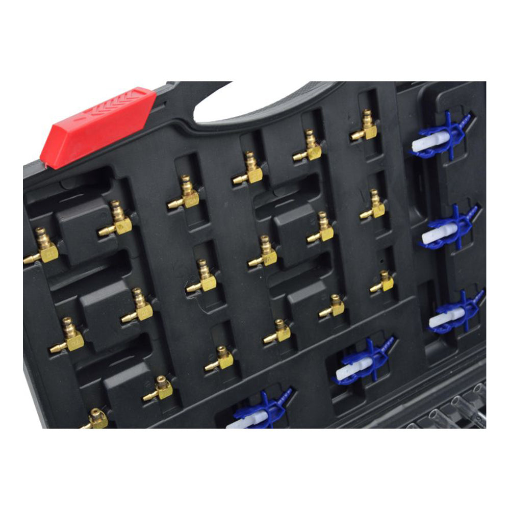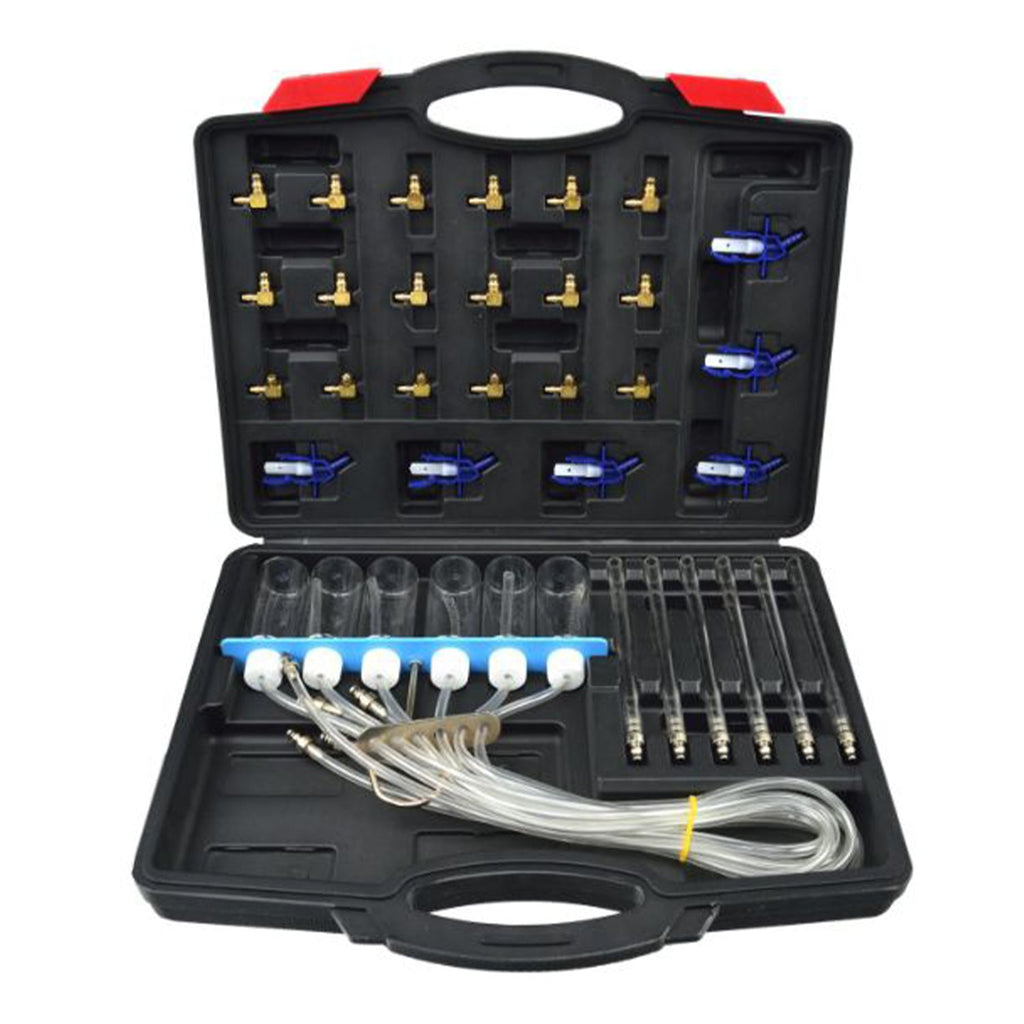 SÚPRAVA NA KONTROLU STRÁT NÁVRATU PALIVA sa používa na testovanie väčšiny palivových systémov s vysokotlakovými čerpadlami Common Rail. Zariadenie sa používa na rýchle a efektívne meranie objemu paliva pri odtoku každého vstrekovača. Táto súprava umožňuje súčasné meranie na 6 vstrekovačoch.