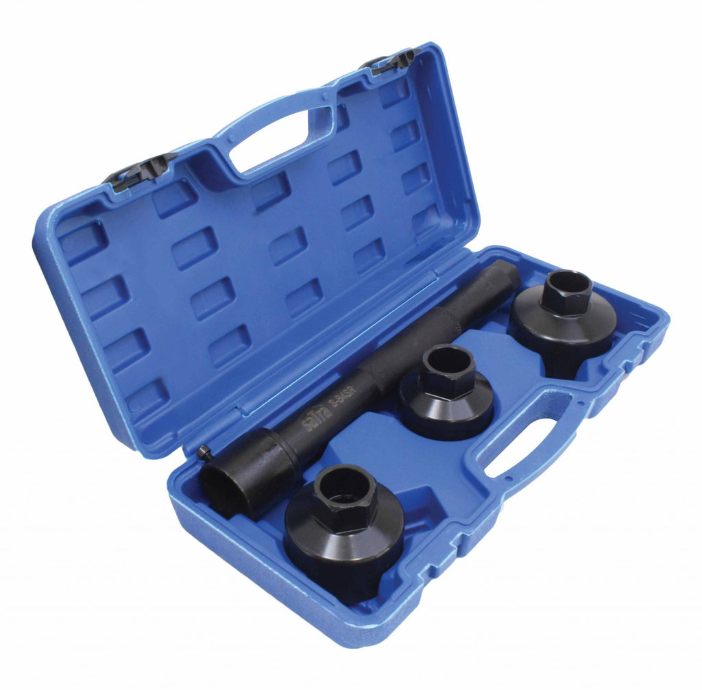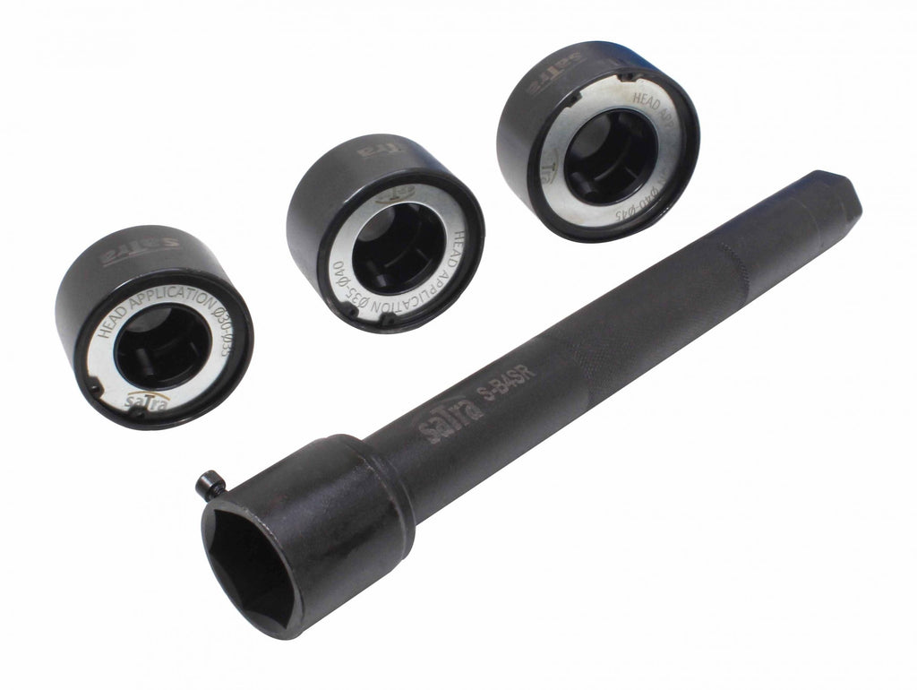 SÚPRAVA NA MONTÁŽ A DEMONTÁŽ RIADIACICH TYČÍ 4 KUSY SATRA obsahuje základný nástroj a 3 vymeniteľné hlavice, ktoré pokrývajú široký rozsah veľkostí: 30-35 mm, 35-40 mm a 40-45 mm. Kľúče sú špeciálne prispôsobené na uľahčenie montáže aj demontáže riadiacich tyčí bez poškodenia okolitých komponentov.