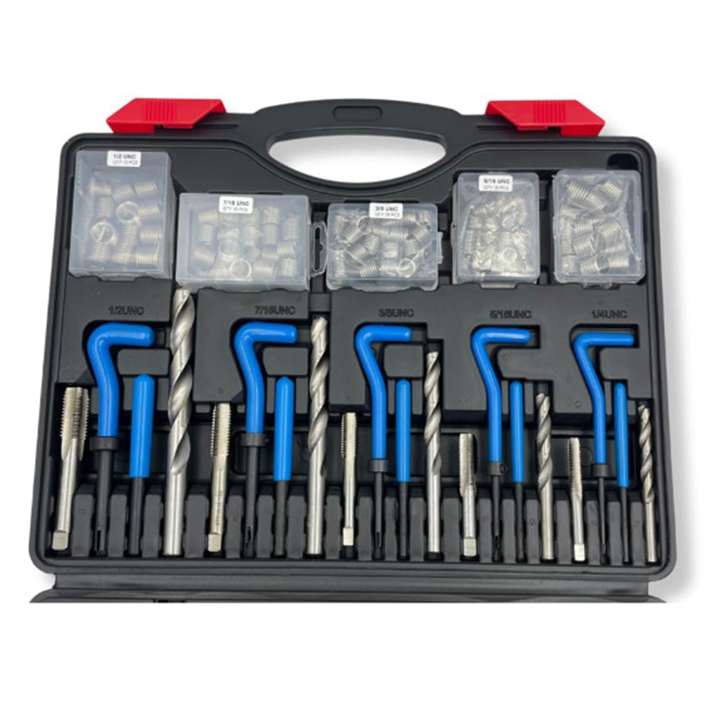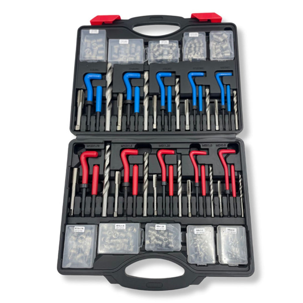KOMPLETNÁ SADA NA OPRAVU ZÁVITOV M5-M12 1/4"-1/2" 314 KUSOV obsahuje vrtáky, závitníky, závitové vložky a zostavy tyčí a nástroje na odlamovanie v 5 najpotrebnejších rozmeroch SAE a metrických. Do sady sú zahrnuté tieto rozmery: 1/4”, 5/16”, 3/8”, 7/16” a 1/2", ako aj M5, M6, M8, M10 a M12.